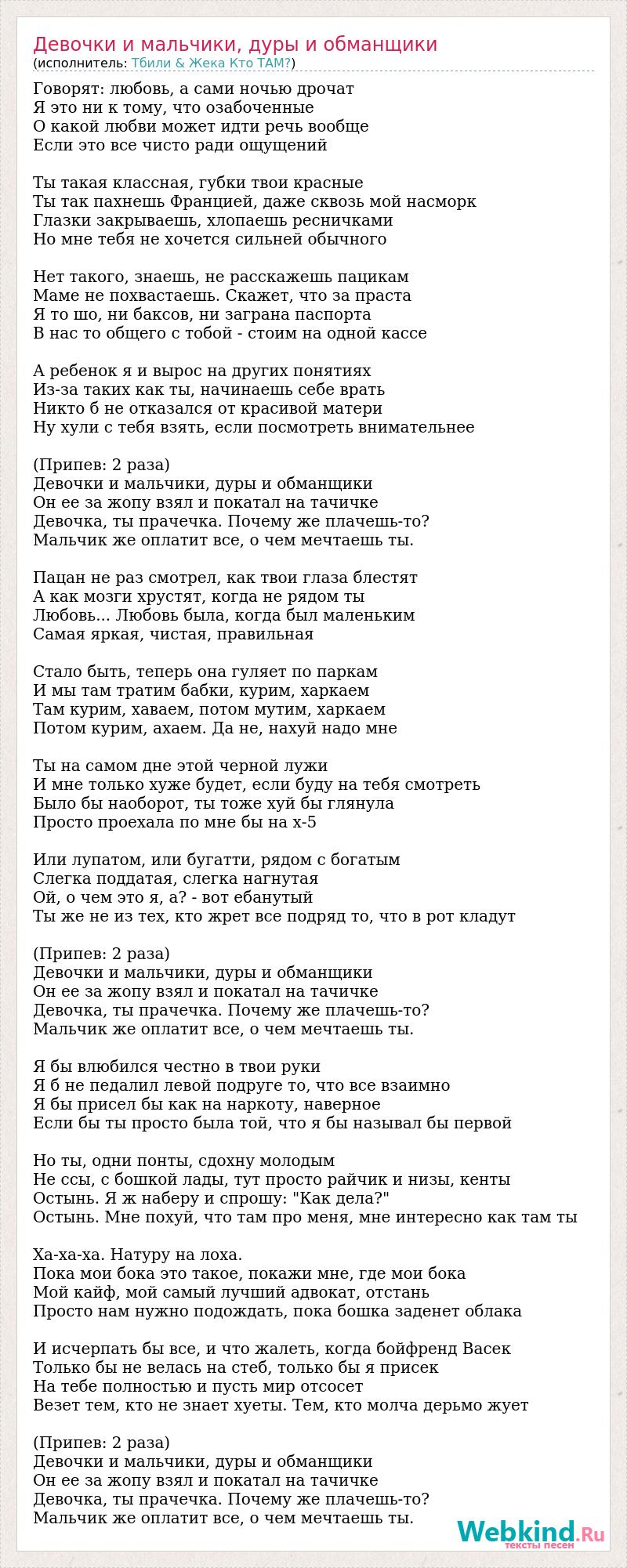 Говорят: любовь, а сами ночью дрочат Я это ни к тому, что озабоченные О какой любви может идти речь вообще Если это все чисто ради ощущений Ты такая классная, губки твои красные Ты так пахнешь Францией, даже сквозь мой насморк Глазки закрываешь, хлопаешь ресничками Но мне тебя не хочется сильней обычного Нет такого, знаешь, не расскажешь пацикам Маме не похвастаешь. Скажет, что за праста Я то шо, ни баксов, ни заграна паспорта В нас то общего с тобой - стоим на одной кассе А ребенок я и вырос на других понятиях Из-за таких как ты, начинаешь себе врать Никто б не отказался от красивой матери Ну хули с тебя взять, если посмотреть внимательнее (Припев: 2 раза) Девочки и мальчики, дуры и обманщики Он ее за жопу взял и покатал на тачичке Девочка, ты прачечка. Почему же плачешь-то? Мальчик же оплатит все, о чем мечтаешь ты. Пацан не раз смотрел, как твои глаза блестят А как мозги хрустят, когда не рядом ты Любовь... Любовь была, когда был маленьким Самая яркая, чистая, правильная Стало быть, теперь она гуляет по паркам И мы там тратим бабки, курим, харкаем Там курим, хаваем, потом мутим, харкаем Потом курим, ахаем. Да не, нахуй надо мне Ты на самом дне этой черной лужи И мне только хуже будет, если буду на тебя смотреть Было бы наоборот, ты тоже хуй бы глянула Просто проехала по мне бы на x-5 Или лупатом, или бугатти, рядом с богатым Слегка поддатая, слегка нагнутая Ой, о чем это я, а? - вот ебанутый Ты же не из тех, кто жрет все подряд то, что в рот кладут (Припев: 2 раза) Девочки и мальчики, дуры и обманщики Он ее за жопу взял и покатал на тачичке Девочка, ты прачечка. Почему же плачешь-то? Мальчик же оплатит все, о чем мечтаешь ты. Я бы влюбился честно в твои руки Я б не педалил левой подруге то, что все взаимно Я бы присел бы как на наркоту, наверное Если бы ты просто была той, что я бы называл бы первой Но ты, одни понты, сдохну молодым Не ссы, с бошкой лады, тут просто райчик и низы, кенты Остынь. Я ж наберу и спрошу: "Как дела?" Остынь. Мне похуй, что там про меня, мне интересно как там ты Ха-ха-ха. Натуру на лоха. Пока мои бока это такое, покажи мне, где мои бока Мой кайф, мой самый лучший адвокат, отстань Просто нам нужно подождать, пока бошка заденет облака И исчерпать бы все, и что жалеть, когда бойфренд Васек Только бы не велась на стеб, только бы я присек На тебе полностью и пусть мир отсосет Везет тем, кто не знает хуеты. Тем, кто молча дерьмо жует (Припев: 2 раза) Девочки и мальчики, дуры и обманщики Он ее за жопу взял и покатал на тачичке Девочка, ты прачечка. Почему же плачешь-то? Мальчик же оплатит все, о чем мечтаешь ты.