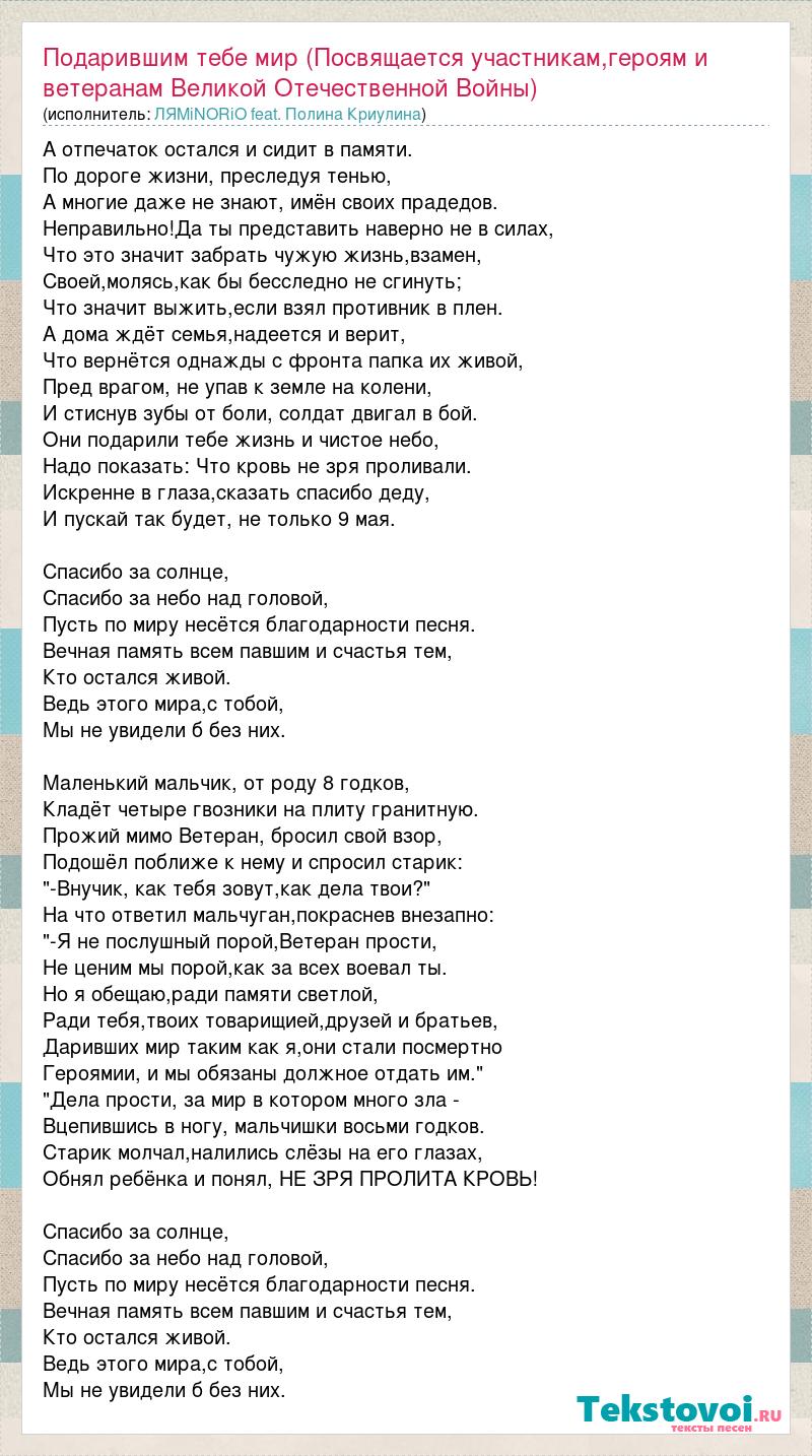 А отпечаток остался и сидит в памяти. По дороге жизни, преследуя тенью, А многие даже не знают, имён своих прадедов. Неправильно!Да ты представить наверно не в силах, Что это значит забрать чужую жизнь,взамен, Своей,молясь,как бы бесследно не сгинуть; Что значит выжить,если взял противник в плен. А дома ждёт семья,надеется и верит, Что вернётся однажды с фронта папка их живой, Пред врагом, не упав к земле на колени, И стиснув зубы от боли, солдат двигал в бой. Они подарили тебе жизнь и чистое небо, Надо показать: Что кровь не зря проливали. Искренне в глаза,сказать спасибо деду, И пускай так будет, не только 9 мая. Спасибо за солнце, Спасибо за небо над головой, Пусть по миру несётся благодарности песня. Вечная память всем павшим и счастья тем, Кто остался живой. Ведь этого мира,с тобой, Мы не увидели б без них. Маленький мальчик, от роду 8 годков, Кладёт четыре гвозники на плиту гранитную. Прожий мимо Ветеран, бросил свой взор, Подошёл поближе к нему и спросил старик: "-Внучик, как тебя зовут,как дела твои?" На что ответил мальчуган,покраснев внезапно: "-Я не послушный порой,Ветеран прости, Не ценим мы порой,как за всех воевал ты. Но я обещаю,ради памяти светлой, Ради тебя,твоих товарищией,друзей и братьев, Даривших мир таким как я,они стали посмертно Героямии, и мы обязаны должное отдать им." "Дела прости, за мир в котором много зла - Вцепившись в ногу, мальчишки восьми годков. Старик молчал,налились слёзы на его глазах, Обнял ребёнка и понял, НЕ ЗРЯ ПРОЛИТА КРОВЬ! Спасибо за солнце, Спасибо за небо над головой, Пусть по миру несётся благодарности песня. Вечная память всем павшим и счастья тем, Кто остался живой. Ведь этого мира,с тобой, Мы не увидели б без них.