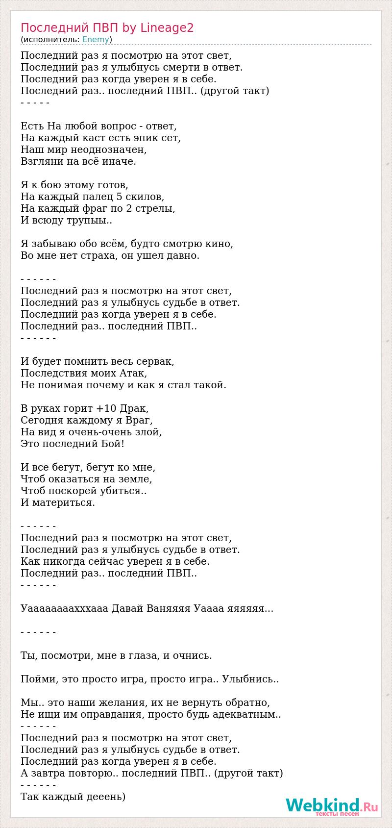 Последний раз я посмотрю на этот свет, Последний раз я улыбнусь смерти в ответ. Последний раз когда уверен я в себе. Последний раз.. последний ПВП.. (другой такт) - - - - - Есть На любой вопрос - ответ, На каждый каст есть эпик сет, Наш мир неоднозначен, Взгляни на всё иначе. Я к бою этому готов, На каждый палец 5 скилов, На каждый фраг по 2 стрелы, И всюду трупыы.. Я забываю обо всём, будто смотрю кино, Во мне нет страха, он ушел давно. - - - - - - Последний раз я посмотрю на этот свет, Последний раз я улыбнусь судьбе в ответ. Последний раз когда уверен я в себе. Последний раз.. последний ПВП.. - - - - - - И будет помнить весь сервак, Последствия моих Атак, Не понимая почему и как я стал такой. В руках горит +10 Драк, Сегодня каждому я Враг, На вид я очень-очень злой, Это последний Бой! И все бегут, бегут ко мне, Чтоб оказаться на земле, Чтоб поскорей убиться.. И материться. - - - - - - Последний раз я посмотрю на этот свет, Последний раз я улыбнусь судьбе в ответ. Как никогда сейчас уверен я в себе. Последний раз.. последний ПВП.. - - - - - - Уаааааааахххааа Давай Ваняяяя Уаааа яяяяяя... - - - - - - Ты, посмотри, мне в глаза, и очнись. Пойми, это просто игра, просто игра.. Улыбнись.. Мы.. это наши желания, их не вернуть обратно, Не ищи им оправдания, просто будь адекватным.. - - - - - - Последний раз я посмотрю на этот свет, Последний раз я улыбнусь судьбе в ответ. Последний раз когда уверен я в себе. А завтра повторю.. последний ПВП.. (другой такт) - - - - - - Так каждый дееень)
