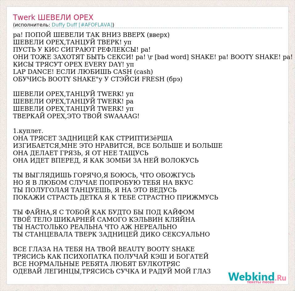 ра! ПОПОЙ ШЕВЕЛИ ТАК ВНИЗ ВВЕРХ (вверх) ШЕВЕЛИ ОРЕХ,ТАНЦУЙ ТВЕРК! уп ПУСТЬ У КИС СИГРАЮТ РЕФЛЕКСЫ! ра! ОНИ ТОЖЕ ЗАХОТЯТ БЫТЬ СЕКСИ! ра! \r [bad word] SHAKE! ра! BOOTY SHAKE! ра! КИСЫ ТРЯСУТ ОРЕХ EVERY DAY! уп LAP DANCE! ЕСЛИ ЛЮБИШЬ CASH (cash) ОБУЧИСЬ BOOTY SHAKE"у У СТЭЙСИ FRESH (брэ) ШЕВЕЛИ ОРЕХ,ТАНЦУЙ TWERK! уп ШЕВЕЛИ ОРЕХ,ТАНЦУЙ TWERK! ра ШЕВЕЛИ ОРЕХ,ТАНЦУЙ TWERK! уп ТВЕРКАЙ ОРЕХ,ЭТО ТВОЙ SWAAAAG! 1.куплет. ОНА ТРЯСЕТ ЗАДНИЦЕЙ КАК СТРИПТИЗёРША ИЗГИБАЕТСЯ,МНЕ ЭТО НРАВИТСЯ, ВСЕ БОЛЬШЕ И БОЛЬШЕ ОНА ДЕЛАЕТ ГРЯЗЬ, Я ОТ НЕЕ ТАЩУСЬ ОНА ИДЕТ ВПЕРЕД, Я КАК ЗОМБИ ЗА НЕЙ ВОЛОКУСЬ ТЫ ВЫГЛЯДИШЬ ГОРЯЧО,Я БОЮСЬ, ЧТО ОБОЖГУСЬ НО Я В ЛЮБОМ СЛУЧАЕ ПОПРОБУЮ ТЕБЯ НА ВКУС ТЫ ПОЛУГОЛАЯ ТАНЦУЕШЬ, Я НА ЭТО ВЕДУСЬ ПОКАЖИ СТРАСТЬ ДЕТКА Я К ТЕБЕ СТРАСТНО ПРИЖМУСЬ ТЫ ФАЙНА,Я С ТОБОЙ КАК БУДТО БЫ ПОД КАЙФОМ ТВОЁ ТЕЛО ШИКАРНЕЙ САМОГО КЭЛЬВИН КЛЯЙНА ТЫ НАСТОЛЬКО РЕАЛЬНА ЧТО АЖ НЕРЕАЛЬНО ТЫ СТАНЦЕВАЛА ТВЕРК ЗАДНИЦЕЙ ДИКО СЕКСУАЛЬНО ВСЕ ГЛАЗА НА ТЕБЯ НА ТВОЙ BEAUTY BOOTY SHAKE ТРЯСИСЬ КАК ПСИХОПАТКА ПОЛУЧАЙ КЭШ И БОГАТЕЙ ВСЕ НОРМАЛЬНЫЕ РЕБЯТА ЛЮБЯТ БУЛКОТРЯС ОДЕВАЙ ЛЕГИНЦЫ,ТРЯСИСЬ СУЧКА И РАДУЙ МОЙ ГЛАЗ