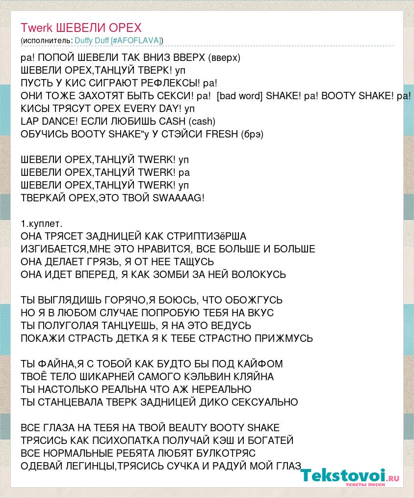 ра! ПОПОЙ ШЕВЕЛИ ТАК ВНИЗ ВВЕРХ (вверх) ШЕВЕЛИ ОРЕХ,ТАНЦУЙ ТВЕРК! уп ПУСТЬ У КИС СИГРАЮТ РЕФЛЕКСЫ! ра! ОНИ ТОЖЕ ЗАХОТЯТ БЫТЬ СЕКСИ! ра! [bad word] SHAKE! ра! BOOTY SHAKE! ра! КИСЫ ТРЯСУТ ОРЕХ EVERY DAY! уп LAP DANCE! ЕСЛИ ЛЮБИШЬ CASH (cash) ОБУЧИСЬ BOOTY SHAKE"у У СТЭЙСИ FRESH (брэ) ШЕВЕЛИ ОРЕХ,ТАНЦУЙ TWERK! уп ШЕВЕЛИ ОРЕХ,ТАНЦУЙ TWERK! ра ШЕВЕЛИ ОРЕХ,ТАНЦУЙ TWERK! уп ТВЕРКАЙ ОРЕХ,ЭТО ТВОЙ SWAAAAG! 1.куплет. ОНА ТРЯСЕТ ЗАДНИЦЕЙ КАК СТРИПТИЗёРША ИЗГИБАЕТСЯ,МНЕ ЭТО НРАВИТСЯ, ВСЕ БОЛЬШЕ И БОЛЬШЕ ОНА ДЕЛАЕТ ГРЯЗЬ, Я ОТ НЕЕ ТАЩУСЬ ОНА ИДЕТ ВПЕРЕД, Я КАК ЗОМБИ ЗА НЕЙ ВОЛОКУСЬ ТЫ ВЫГЛЯДИШЬ ГОРЯЧО,Я БОЮСЬ, ЧТО ОБОЖГУСЬ НО Я В ЛЮБОМ СЛУЧАЕ ПОПРОБУЮ ТЕБЯ НА ВКУС ТЫ ПОЛУГОЛАЯ ТАНЦУЕШЬ, Я НА ЭТО ВЕДУСЬ ПОКАЖИ СТРАСТЬ ДЕТКА Я К ТЕБЕ СТРАСТНО ПРИЖМУСЬ ТЫ ФАЙНА,Я С ТОБОЙ КАК БУДТО БЫ ПОД КАЙФОМ ТВОЁ ТЕЛО ШИКАРНЕЙ САМОГО КЭЛЬВИН КЛЯЙНА ТЫ НАСТОЛЬКО РЕАЛЬНА ЧТО АЖ НЕРЕАЛЬНО ТЫ СТАНЦЕВАЛА ТВЕРК ЗАДНИЦЕЙ ДИКО СЕКСУАЛЬНО ВСЕ ГЛАЗА НА ТЕБЯ НА ТВОЙ BEAUTY BOOTY SHAKE ТРЯСИСЬ КАК ПСИХОПАТКА ПОЛУЧАЙ КЭШ И БОГАТЕЙ ВСЕ НОРМАЛЬНЫЕ РЕБЯТА ЛЮБЯТ БУЛКОТРЯС ОДЕВАЙ ЛЕГИНЦЫ,ТРЯСИСЬ СУЧКА И РАДУЙ МОЙ ГЛАЗ