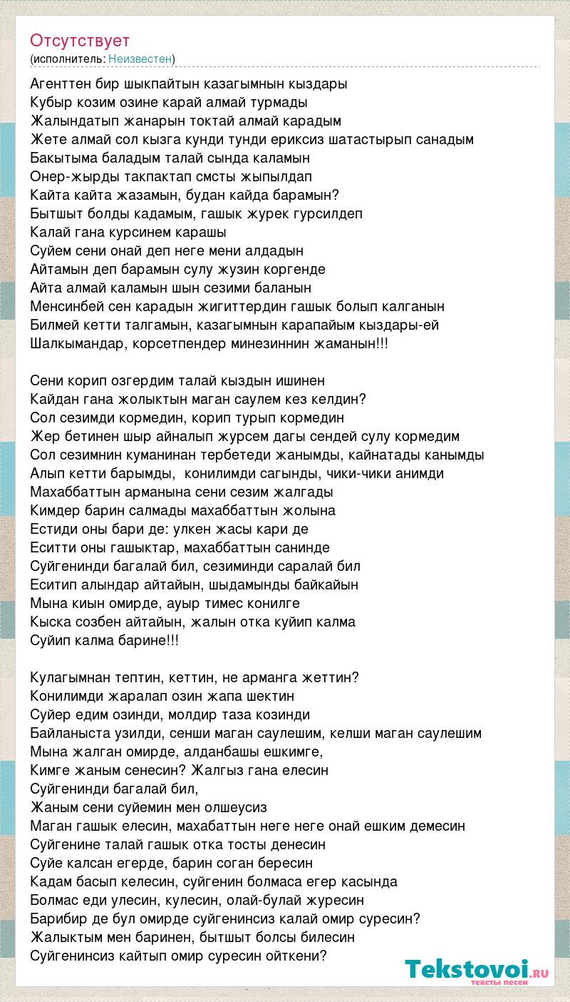 Агенттен бир шыкпайтын казагымнын кыздары Кубыр козим озине карай алмай турмады Жалындатып жанарын токтай алмай карадым Жете алмай сол кызга кунди тунди ериксиз шатастырып санадым Бакытыма баладым талай сында каламын Онер-жырды такпактап смсты жыпылдап Кайта кайта жазамын, будан кайда барамын? Бытшыт болды кадамым, гашык журек гурсилдеп Калай гана курсинем карашы Суйем сени онай деп неге мени алдадын Айтамын деп барамын сулу жузин коргенде Айта алмай каламын шын сезими баланын Менсинбей сен карадын жигиттердин гашык болып калганын Билмей кетти талгамын, казагымнын карапайым кыздары-ей Шалкымандар, корсетпендер минезиннин жаманын!!! Сени корип озгердим талай кыздын ишинен Кайдан гана жолыктын маган саулем кез келдин? Сол сезимди кормедин, корип турып кормедин Жер бетинен шыр айналып журсем дагы сендей сулу кормедим Сол сезимнин куманинан тербетеди жанымды, кайнатады канымды Алып кетти барымды, конилимди сагынды, чики-чики анимди Махаббаттын арманына сени сезим жалгады Кимдер барин салмады махаббаттын жолына Естиди оны бари де: улкен жасы кари де Еситти оны гашыктар, махаббаттын санинде Суйгенинди багалай бил, сезиминди саралай бил Еситип алындар айтайын, шыдамынды байкайын Мына киын омирде, ауыр тимес конилге Кыска созбен айтайын, жалын отка куйип калма Суйип калма барине!!! Кулагымнан тептин, кеттин, не арманга жеттин? Конилимди жаралап озин жапа шектин Суйер едим озинди, молдир таза козинди Байланыста узилди, сенши маган саулешим, келши маган саулешим Мына жалган омирде, алданбашы ешкимге, Кимге жаным сенесин? Жалгыз гана елесин Суйгенинди багалай бил, Жаным сени суйемин мен олшеусиз Маган гашык елесин, махабаттын неге неге онай ешким демесин Суйгенине талай гашык отка тосты денесин Суйе калсан егерде, барин соган бересин Кадам басып келесин, суйгенин болмаса егер касында Болмас еди улесин, кулесин, олай-булай журесин Барибир де бул омирде суйгенинсиз калай омир суресин? Жалыктым мен баринен, бытшыт болсы билесин Суйгенинсиз кайтып омир суресин ойткени?