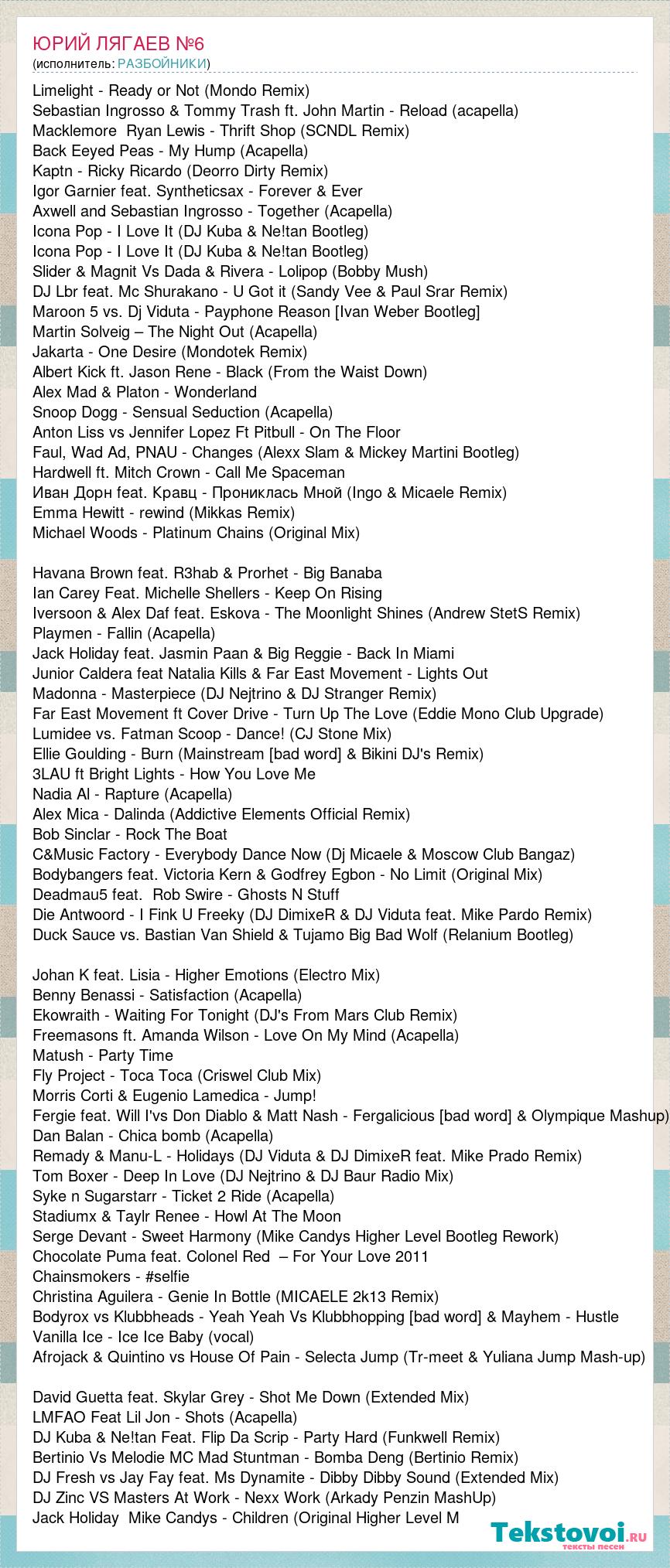 Limelight - Ready or Not (Mondo Remix) Sebastian Ingrosso & Tommy Trash ft. John Martin - Reload (acapella) Macklemore Ryan Lewis - Thrift Shop (SCNDL Remix) Back Eeyed Peas - My Hump (Acapella) Kaptn - Ricky Ricardo (Deorro Dirty Remix) Igor Garnier feat. Syntheticsax - Forever & Ever Axwell and Sebastian Ingrosso - Together (Acapella) Icona Pop - I Love It (DJ Kuba & Ne!tan Bootleg) Icona Pop - I Love It (DJ Kuba & Ne!tan Bootleg) Slider & Magnit Vs Dada & Rivera - Lolipop (Bobby Mush) DJ Lbr feat. Mc Shurakano - U Got it (Sandy Vee & Paul Srar Remix) Maroon 5 vs. Dj Viduta - Payphone Reason [Ivan Weber Bootleg] Martin Solveig – The Night Out (Acapella) Jakarta - One Desire (Mondotek Remix) Albert Kick ft. Jason Rene - Black (From the Waist Down) Alex Mad & Platon - Wonderland Snoop Dogg - Sensual Seduction (Acapella) Anton Liss vs Jennifer Lopez Ft Pitbull - On The Floor Faul, Wad Ad, PNAU - Changes (Alexx Slam & Mickey Martini Bootleg) Hardwell ft. Mitch Crown - Call Me Spaceman Иван Дорн feat. Кравц - Прониклась Мной (Ingo & Micaele Remix) Emma Hewitt - rewind (Mikkas Remix) Michael Woods - Platinum Chains (Original Mix) Havana Brown feat. R3hab & Prorhet - Big Banaba Ian Carey Feat. Michelle Shellers - Keep On Rising Iversoon & Alex Daf feat. Eskova - The Moonlight Shines (Andrew StetS Remix) Playmen - Fallin (Acapella) Jack Holiday feat. Jasmin Paan & Big Reggie - Back In Miami Junior Caldera feat Natalia Kills & Far East Movement - Lights Out Madonna - Masterpiece (DJ Nejtrino & DJ Stranger Remix) Far East Movement ft Cover Drive - Turn Up The Love (Eddie Mono Club Upgrade) Lumidee vs. Fatman Scoop - Dance! (CJ Stone Mix) Ellie Goulding - Burn (Mainstream [bad word] & Bikini DJ's Remix) 3LAU ft Bright Lights - How You Love Me Nadia Al - Rapture (Acapella) Alex Mica - Dalinda (Addictive Elements Official Remix) Bob Sinclar - Rock The Boat C&Music Factory - Everybody Dance Now (Dj Micaele & Moscow Club Bangaz) Bodybangers feat. Victoria Kern & Godfrey Egbon - No Limit (Original Mix) Deadmau5 feat. Rob Swire - Ghosts N Stuff Die Antwoord - I Fink U Freeky (DJ DimixeR & DJ Viduta feat. Mike Pardo Remix) Duck Sauce vs. Bastian Van Shield & Tujamo Big Bad Wolf (Relanium Bootleg) Johan K feat. Lisia - Higher Emotions (Electro Mix) Benny Benassi - Satisfaction (Acapella) Ekowraith - Waiting For Tonight (DJ's From Mars Club Remix) Freemasons ft. Amanda Wilson - Love On My Mind (Acapella) Matush - Party Time Fly Project - Toca Toca (Criswel Club Mix) Morris Corti & Eugenio Lamedica - Jump! Fergie feat. Will I'vs Don Diablo & Matt Nash - Fergalicious (Krupa & Olympique Mashup) Dan Balan - Chica bomb (Acapella) Remady & Manu-L - Holidays (DJ Viduta & DJ DimixeR feat. Mike Prado Remix) Tom Boxer - Deep In Love (DJ Nejtrino & DJ Baur Radio Mix) Syke n Sugarstarr - Ticket 2 Ride (Acapella) Stadiumx & Taylr Renee - Howl At The Moon Serge Devant - Sweet Harmony (Mike Candys Higher Level Bootleg Rework) Chocolate Puma feat. Colonel Red – For Your Love 2011 Chainsmokers - #selfie Christina Aguilera - Genie In Bottle (MICAELE 2k13 Remix) Bodyrox vs Klubbheads - Yeah Yeah Vs Klubbhopping Antuiserum & Mayhem - Hustle Vanilla Ice - Ice Ice Baby (vocal) Afrojack & Quintino vs House Of Pain - Selecta Jump (Tr-meet & Yuliana Jump Mash-up) David Guetta feat. Skylar Grey - Shot Me Down (Extended Mix) LMFAO Feat Lil Jon - Shots (Acapella) DJ Kuba & Ne!tan Feat. Flip Da Scrip - Party Hard (Funkwell Remix) Bertinio Vs Melodie MC Mad Stuntman - Bomba Deng (Bertinio Remix) DJ Fresh vs Jay Fay feat. Ms Dynamite - Dibby Dibby Sound (Extended Mix) DJ Zinc VS Masters At Work - Nexx Work (Arkady Penzin MashUp) Jack Holiday Mike Candys - Children (Original Higher Level M