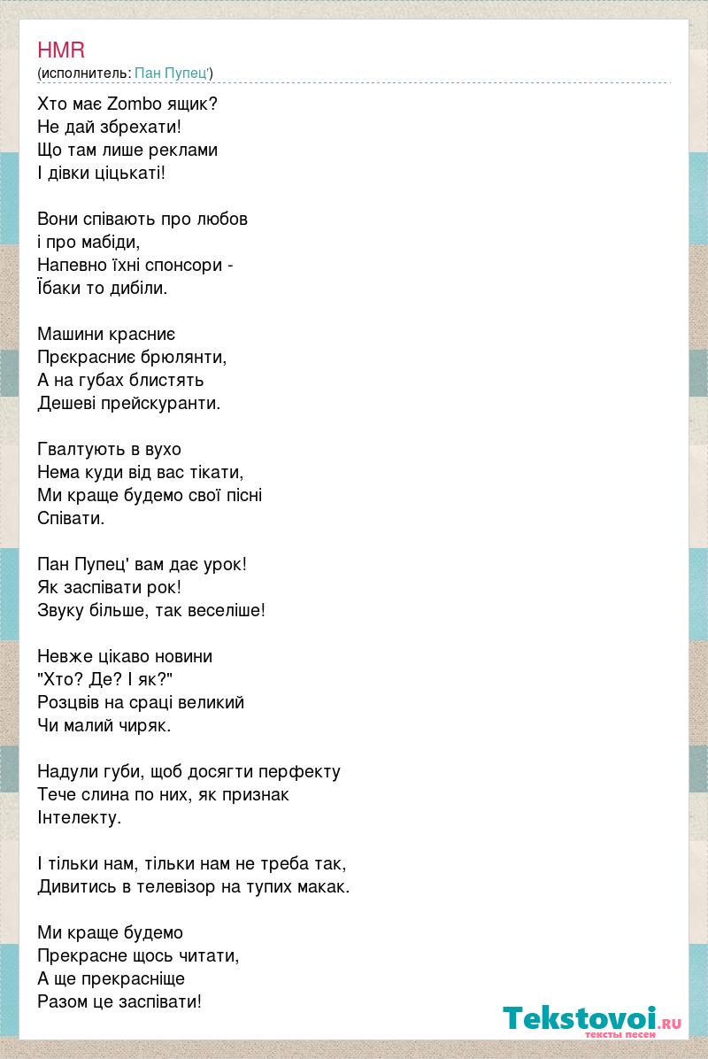 Хто має Zombo ящик? Не дай збрехати! Що там лише реклами І дівки ціцькаті! Вони співають про любов і про мабіди, Напевно їхні спонсори - Їбаки то дибіли. Машини красниє Прєкрасниє брюлянти, А на губах блистять Дешеві прейскуранти. Гвалтують в вухо Нема куди від вас тікати, Ми краще будемо свої пісні Співати. Пан Пупец' вам дає урок! Як заспівати рок! Звуку більше, так веселіше! Невже цікаво новини "Хто? Де? І як?" Розцвів на сраці великий Чи малий чиряк. Надули губи, щоб досягти перфекту Тече слина по них, як признак Інтелекту. І тільки нам, тільки нам не треба так, Дивитись в телевізор на тупих макак. Ми краще будемо Прекрасне щось читати, А ще прекрасніще Разом це заспівати!