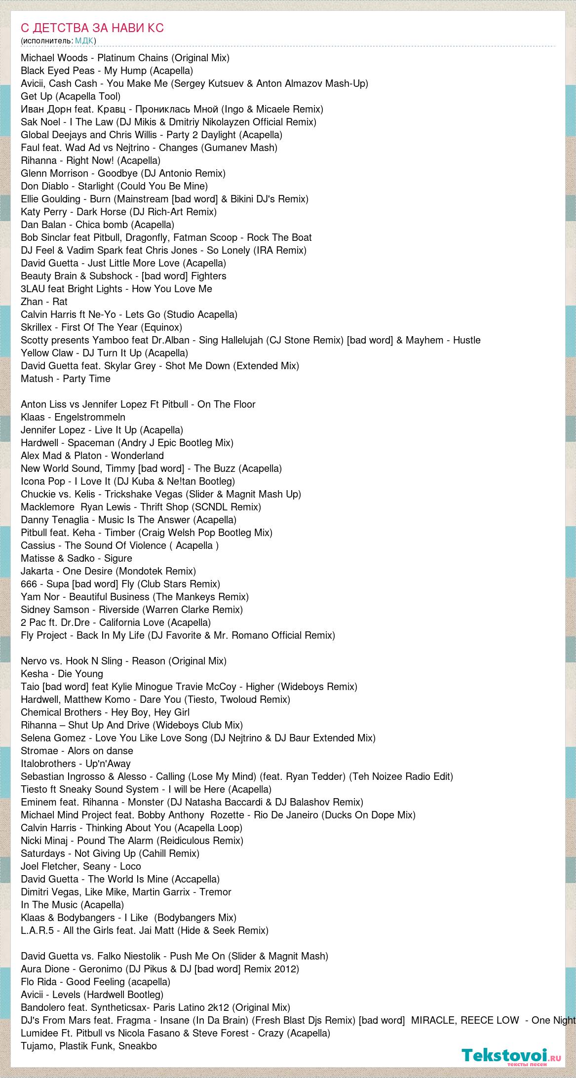 Michael Woods - Platinum Chains (Original Mix) Black Eyed Peas - My Hump (Acapella) Avicii, Cash Cash - You Make Me (Sergey Kutsuev & Anton Almazov Mash-Up) Get Up (Acapella Tool) Иван Дорн feat. Кравц - Прониклась Мной (Ingo & Micaele Remix) Sak Noel - I The Law (DJ Mikis & Dmitriy Nikolayzen Official Remix) Global Deejays and Chris Willis - Party 2 Daylight (Acapella) Faul feat. Wad Ad vs Nejtrino - Changes (Gumanev Mash) Rihanna - Right Now! (Acapella) Glenn Morrison - Goodbye (DJ Antonio Remix) Don Diablo - Starlight (Could You Be Mine) Ellie Goulding - Burn (Mainstream [bad word] & Bikini DJ's Remix) Katy Perry - Dark Horse (DJ Rich-Art Remix) Dan Balan - Chica bomb (Acapella) Bob Sinclar feat Pitbull, Dragonfly, Fatman Scoop - Rock The Boat DJ Feel & Vadim Spark feat Chris Jones - So Lonely (IRA Remix) David Guetta - Just Little More Love (Acapella) Beauty Brain & Subshock - Drunk Fighters 3LAU feat Bright Lights - How You Love Me Zhan - Rat Calvin Harris ft Ne-Yo - Lets Go (Studio Acapella) Skrillex - First Of The Year (Equinox) Scotty presents Yamboo feat Dr.Alban - Sing Hallelujah (CJ Stone Remix) Antuiserum & Mayhem - Hustle Yellow Claw - DJ Turn It Up (Acapella) David Guetta feat. Skylar Grey - Shot Me Down (Extended Mix) Matush - Party Time Anton Liss vs Jennifer Lopez Ft Pitbull - On The Floor Klaas - Engelstrommeln Jennifer Lopez - Live It Up (Acapella) Hardwell - Spaceman (Andry J Epic Bootleg Mix) Alex Mad & Platon - Wonderland New World Sound, Timmy Trumpet - The Buzz (Acapella) Icona Pop - I Love It (DJ Kuba & Ne!tan Bootleg) Chuckie vs. Kelis - Trickshake Vegas (Slider & Magnit Mash Up) Macklemore Ryan Lewis - Thrift Shop (SCNDL Remix) Danny Tenaglia - Music Is The Answer (Acapella) Pitbull feat. Keha - Timber (Craig Welsh Pop Bootleg Mix) Cassius - The Sound Of Violence ( Acapella ) Matisse & Sadko - Sigure Jakarta - One Desire (Mondotek Remix) 666 - Supa [bad word] Fly (Club Stars Remix) Yam Nor - Beautiful Business (The Mankeys Remix) Sidney Samson - Riverside (Warren Clarke Remix) 2 Pac ft. Dr.Dre - California Love (Acapella) Fly Project - Back In My Life (DJ Favorite & Mr. Romano Official Remix) Nervo vs. Hook N Sling - Reason (Original Mix) Kesha - Die Young Taio Cruz feat Kylie Minogue Travie McCoy - Higher (Wideboys Remix) Hardwell, Matthew Komo - Dare You (Tiesto, Twoloud Remix) Chemical Brothers - Hey Boy, Hey Girl Rihanna – Shut Up And Drive (Wideboys Club Mix) Selena Gomez - Love You Like Love Song (DJ Nejtrino & DJ Baur Extended Mix) Stromae - Alors on danse Italobrothers - Up'n'Away Sebastian Ingrosso & Alesso - Calling (Lose My Mind) (feat. Ryan Tedder) (Teh Noizee Radio Edit) Tiesto ft Sneaky Sound System - I will be Here (Acapella) Eminem feat. Rihanna - Monster (DJ Natasha Baccardi & DJ Balashov Remix) Michael Mind Project feat. Bobby Anthony Rozette - Rio De Janeiro (Ducks On Dope Mix) Calvin Harris - Thinking About You (Acapella Loop) Nicki Minaj - Pound The Alarm (Reidiculous Remix) Saturdays - Not Giving Up (Cahill Remix) Joel Fletcher, Seany - Loco David Guetta - The World Is Mine (Accapella) Dimitri Vegas, Like Mike, Martin Garrix - Tremor In The Music (Acapella) Klaas & Bodybangers - I Like (Bodybangers Mix) L.A.R.5 - All the Girls feat. Jai Matt (Hide & Seek Remix) David Guetta vs. Falko Niestolik - Push Me On (Slider & Magnit Mash) Aura Dione - Geronimo (DJ Pikus & DJ Garunoff Remix 2012) Flo Rida - Good Feeling (acapella) Avicii - Levels (Hardwell Bootleg) Bandolero feat. Syntheticsax- Paris Latino 2k12 (Original Mix) DJ's From Mars feat. Fragma - Insane (In Da Brain) (Fresh Blast Djs Remix) [bad word] MIRACLE, REECE LOW - One Night Lumidee Ft. Pitbull vs Nicola Fasano & Steve Forest - Crazy (Acapella) Tujamo, Plastik Funk, Sneakbo