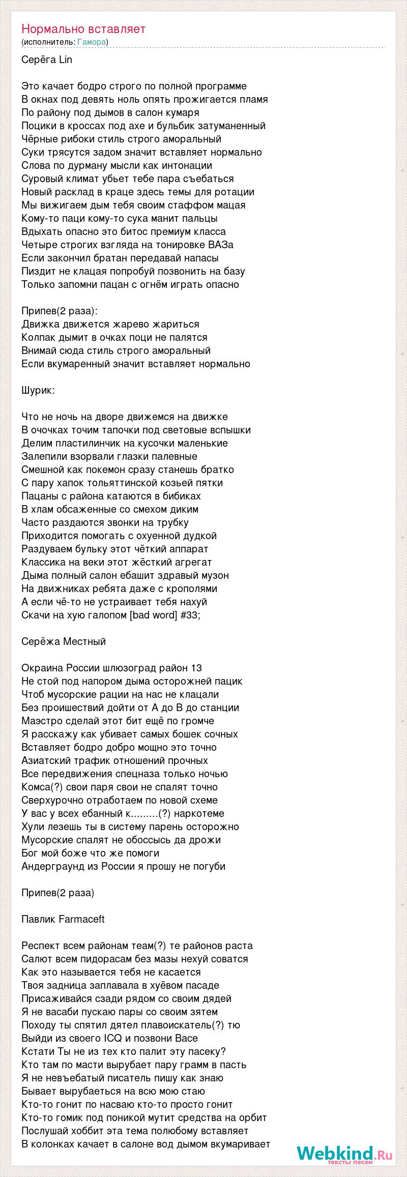 Серёга Lin Это качает бодро строго по полной программе В окнах под девять ноль опять прожигается пламя По району под дымов в салон кумаря Поцики в кроссах под ахе и бульбик затуманенный Чёрные рибоки стиль строго аморальный Суки трясутся задом значит вставляет нормально Слова по дурману мысли как интонации Суровый климат убьет тебе пара съебаться Новый расклад в краце здесь темы для ротации Мы вижигаем дым тебя своим стаффом мацая Кому-то паци кому-то сука манит пальцы Вдыхать опасно это битос премиум класса Четыре строгих взгляда на тонировке ВАЗа Если закончил братан передавай напасы Пиздит не клацая попробуй позвонить на базу Только запомни пацан с огнём играть опасно Припев(2 раза): Движка движется жарево жариться Колпак дымит в очках поци не палятся Внимай сюда стиль строго аморальный Если вкумаренный значит вставляет нормально Шурик: Что не ночь на дворе движемся на движке В очочках точим тапочки под световые вспышки Делим пластилинчик на кусочки маленькие Залепили взорвали глазки палевные Смешной как покемон сразу станешь братко С пару хапок тольяттинской козьей пятки Пацаны с района катаются в бибиках В хлам обсаженные со смехом диким Часто раздаются звонки на трубку Приходится помогать с охуенной дудкой Раздуваем бульку этот чёткий аппарат Классика на веки этот жёсткий агрегат Дыма полный салон ебашит здравый музон На движниках ребята даже с крополями А если чё-то не устраивает тебя нахуй Скачи на хую галопом [bad word] #33; Серёжа Местный Окраина России шлюзоград район 13 Не стой под напором дыма осторожней пацик Чтоб мусорские рации на нас не клацали Без проишествий дойти от А до В до станции Маэстро сделай этот бит ещё по громче Я расскажу как убивает самых бошек сочных Вставляет бодро добро мощно это точно Азиатский трафик отношений прочных Все передвижения спецназа только ночью Комса(?) свои паря свои не спалят точно Сверхурочно отработаем по новой схеме У вас у всех ебанный к.........(?) наркотеме Хули лезешь ты в систему парень осторожно Мусорские спалят не обоссысь да дрожи Бог мой боже что же помоги Андерграунд из России я прошу не погуби Припев(2 раза) Павлик Farmaceft Респект всем районам теам(?) те районов раста Салют всем пидорасам без мазы нехуй соватся Как это называется тебя не касается Твоя задница заплавала в хуёвом пасаде Присаживайся сзади рядом со своим дядей Я не васаби пускаю пары со своим зятем Походу ты спятил дятел плавоискатель(?) тю Выйди из своего ICQ и позвони Васе Кстати Ты не из тех кто палит эту пасеку? Кто там по масти вырубает пару грамм в пасть Я не невъебатый писатель пишу как знаю Бывает вырубаеться на всю мою стаю Кто-то гонит по насваю кто-то просто гонит Кто-то гомик под поникой мутит средства на орбит Послушай хоббит эта тема полюбому вставляет В колонках качает в салоне вод дымом вкумаривает