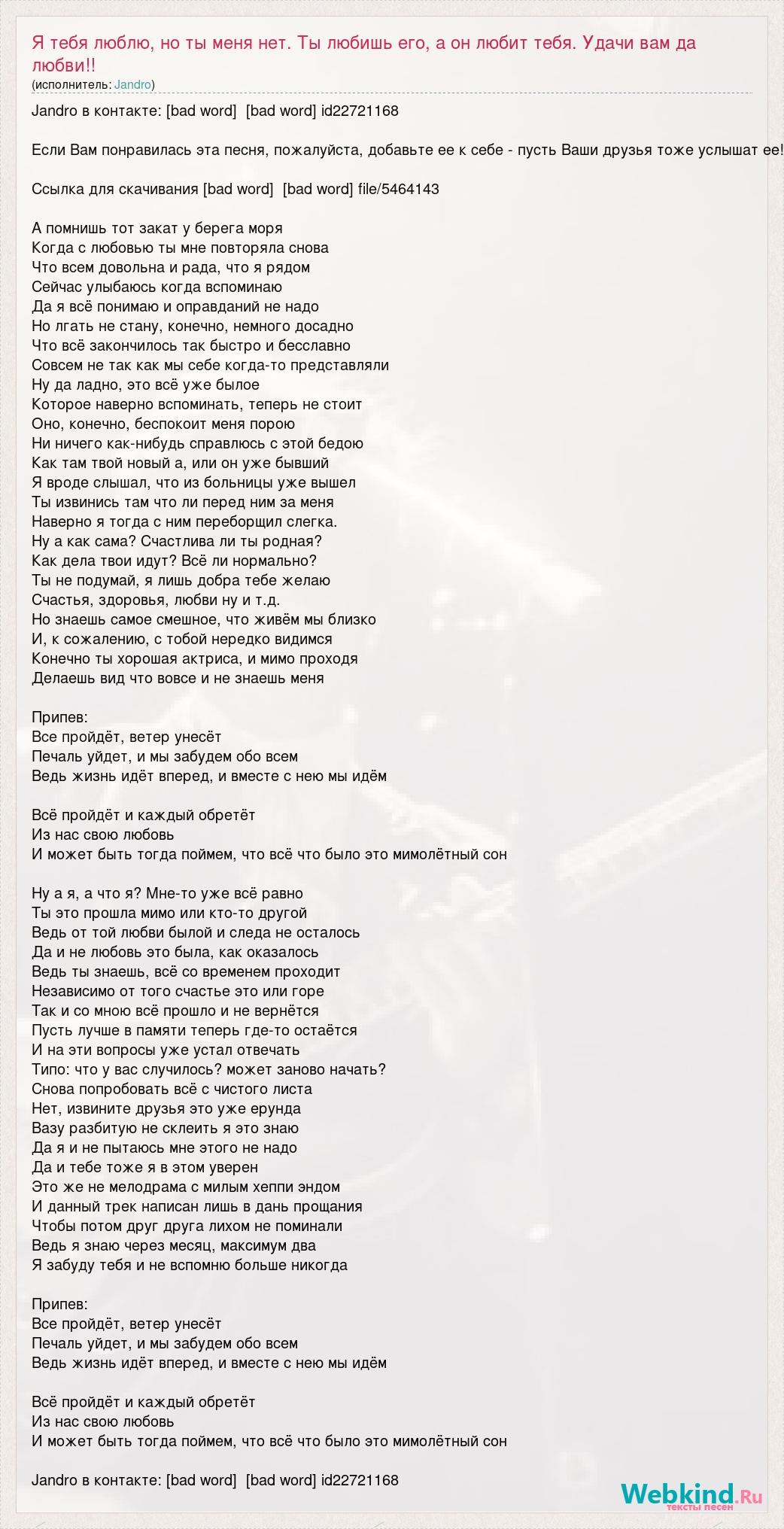 Jandro в контакте: [bad word] [bad word] id22721168 Если Вам понравилась эта песня, пожалуйста, добавьте ее к себе - пусть Ваши друзья тоже услышат ее! Ссылка для скачивания [bad word] [bad word] file/5464143 А помнишь тот закат у берега моря Когда с любовью ты мне повторяла снова Что всем довольна и рада, что я рядом Сейчас улыбаюсь когда вспоминаю Да я всё понимаю и оправданий не надо Но лгать не стану, конечно, немного досадно Что всё закончилось так быстро и бесславно Совсем не так как мы себе когда-то представляли Ну да ладно, это всё уже былое Которое наверно вспоминать, теперь не стоит Оно, конечно, беспокоит меня порою Ни ничего как-нибудь справлюсь с этой бедою Как там твой новый а, или он уже бывший Я вроде слышал, что из больницы уже вышел Ты извинись там что ли перед ним за меня Наверно я тогда с ним переборщил слегка. Ну а как сама? Счастлива ли ты родная? Как дела твои идут? Всё ли нормально? Ты не подумай, я лишь добра тебе желаю Счастья, здоровья, любви ну и т.д. Но знаешь самое смешное, что живём мы близко И, к сожалению, с тобой нередко видимся Конечно ты хорошая актриса, и мимо проходя Делаешь вид что вовсе и не знаешь меня Припев: Все пройдёт, ветер унесёт Печаль уйдет, и мы забудем обо всем Ведь жизнь идёт вперед, и вместе с нею мы идём Всё пройдёт и каждый обретёт Из нас свою любовь И может быть тогда поймем, что всё что было это мимолётный сон Ну а я, а что я? Мне-то уже всё равно Ты это прошла мимо или кто-то другой Ведь от той любви былой и следа не осталось Да и не любовь это была, как оказалось Ведь ты знаешь, всё со временем проходит Независимо от того счастье это или горе Так и со мною всё прошло и не вернётся Пусть лучше в памяти теперь где-то остаётся И на эти вопросы уже устал отвечать Типо: что у вас случилось? может заново начать? Снова попробовать всё с чистого листа Нет, извините друзья это уже ерунда Вазу разбитую не склеить я это знаю Да я и не пытаюсь мне этого не надо Да и тебе тоже я в этом уверен Это же не мелодрама с милым хеппи эндом И данный трек написан лишь в дань прощания Чтобы потом друг друга лихом не поминали Ведь я знаю через месяц, максимум два Я забуду тебя и не вспомню больше никогда Припев: Все пройдёт, ветер унесёт Печаль уйдет, и мы забудем обо всем Ведь жизнь идёт вперед, и вместе с нею мы идём Всё пройдёт и каждый обретёт Из нас свою любовь И может быть тогда поймем, что всё что было это мимолётный сон Jandro в контакте: [bad word] [bad word] id22721168