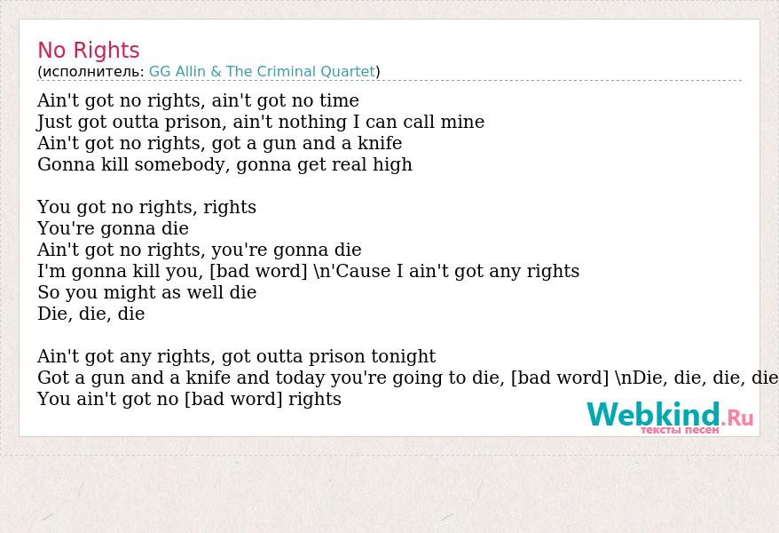 Ain't got no rights, ain't got no time Just got outta prison, ain't nothing I can call mine Ain't got no rights, got a gun and a knife Gonna kill somebody, gonna get real high You got no rights, rights You're gonna die Ain't got no rights, you're gonna die I'm gonna kill you, [bad word] \n'Cause I ain't got any rights So you might as well die Die, die, die Ain't got any rights, got outta prison tonight Got a gun and a knife and today you're going to die, [bad word] \nDie, die, die, die You ain't got no [bad word] rights