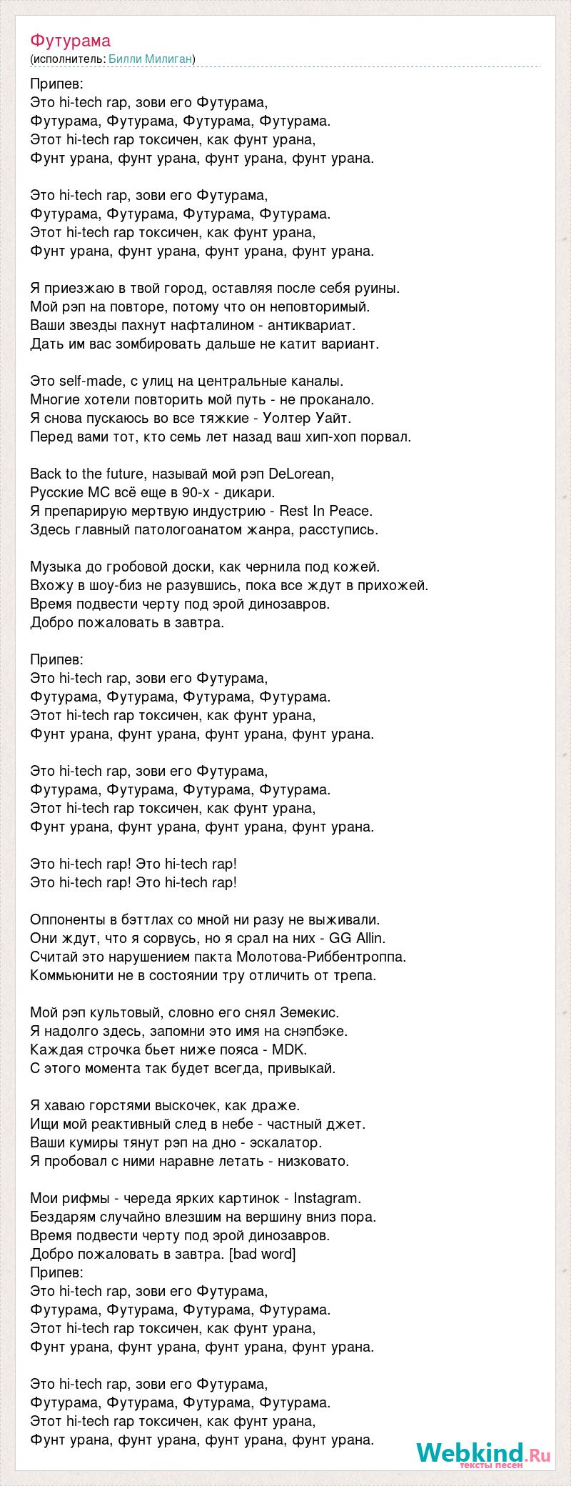 Припев: Это hi-tech rap, зови его Футурама, Футурама, Футурама, Футурама, Футурама. Этот hi-tech rap токсичен, как фунт урана, Фунт урана, фунт урана, фунт урана, фунт урана. Это hi-tech rap, зови его Футурама, Футурама, Футурама, Футурама, Футурама. Этот hi-tech rap токсичен, как фунт урана, Фунт урана, фунт урана, фунт урана, фунт урана. Я приезжаю в твой город, оставляя после себя руины. Мой рэп на повторе, потому что он неповторимый. Ваши звезды пахнут нафталином - антиквариат. Дать им вас зомбировать дальше не катит вариант. Это self-made, с улиц на центральные каналы. Многие хотели повторить мой путь - не проканало. Я снова пускаюсь во все тяжкие - Уолтер Уайт. Перед вами тот, кто семь лет назад ваш хип-хоп порвал. Back to the future, называй мой рэп DeLorean, Русские MC всё еще в 90-х - дикари. Я препарирую мертвую индустрию - Rest In Peace. Здесь главный патологоанатом жанра, расступись. Музыка до гробовой доски, как чернила под кожей. Вхожу в шоу-биз не разувшись, пока все ждут в прихожей. Время подвести черту под эрой динозавров. Добро пожаловать в завтра. Припев: Это hi-tech rap, зови его Футурама, Футурама, Футурама, Футурама, Футурама. Этот hi-tech rap токсичен, как фунт урана, Фунт урана, фунт урана, фунт урана, фунт урана. Это hi-tech rap, зови его Футурама, Футурама, Футурама, Футурама, Футурама. Этот hi-tech rap токсичен, как фунт урана, Фунт урана, фунт урана, фунт урана, фунт урана. Это hi-tech rap! Это hi-tech rap! Это hi-tech rap! Это hi-tech rap! Оппоненты в бэттлах со мной ни разу не выживали. Они ждут, что я сорвусь, но я срал на них - GG Allin. Считай это нарушением пакта Молотова-Риббентроппа. Коммьюнити не в состоянии тру отличить от трепа. Мой рэп культовый, словно его снял Земекис. Я надолго здесь, запомни это имя на снэпбэке. Каждая строчка бьет ниже пояса - MDK. С этого момента так будет всегда, привыкай. Я хаваю горстями выскочек, как драже. Ищи мой реактивный след в небе - частный джет. Ваши кумиры тянут рэп на дно - эскалатор. Я пробовал с ними наравне летать - низковато. Мои рифмы - череда ярких картинок - Instagram. Бездарям случайно влезшим на вершину вниз пора. Время подвести черту под эрой динозавров. Добро пожаловать в завтра. [bad word] Припев: Это hi-tech rap, зови его Футурама, Футурама, Футурама, Футурама, Футурама. Этот hi-tech rap токсичен, как фунт урана, Фунт урана, фунт урана, фунт урана, фунт урана. Это hi-tech rap, зови его Футурама, Футурама, Футурама, Футурама, Футурама. Этот hi-tech rap токсичен, как фунт урана, Фунт урана, фунт урана, фунт урана, фунт урана.