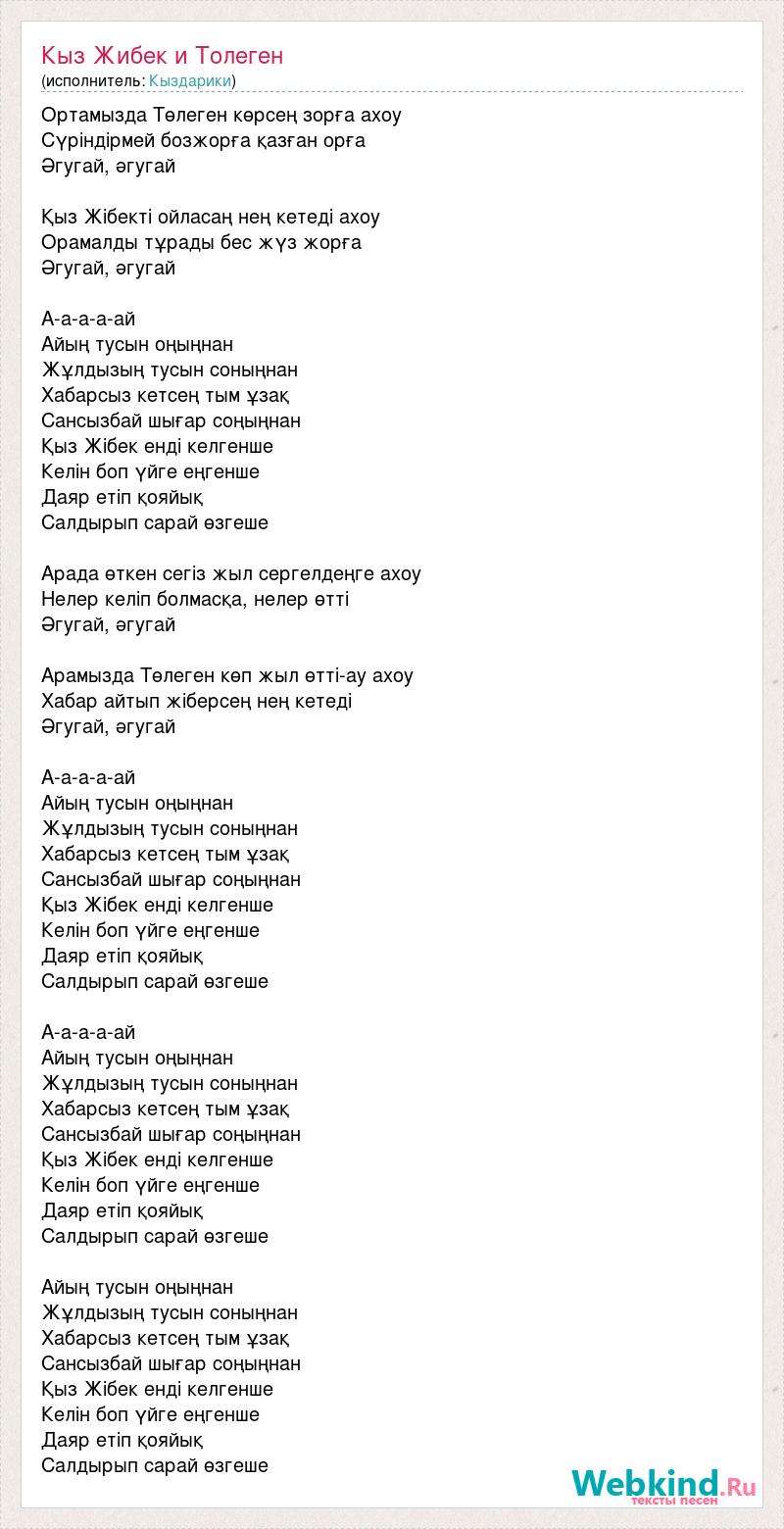 Ортамызда Төлеген көрсең зорға ахоу Сүріндірмей бозжорға қазған орға Әгугай, әгугай Қыз Жібекті ойласаң нең кетеді ахоу Орамалды тұрады бес жүз жорға Әгугай, әгугай А-а-а-а-ай Айың тусын оңыңнан Жұлдызың тусын соныңнан Хабарсыз кетсең тым ұзақ Сансызбай шығар соңыңнан Қыз Жібек енді келгенше Келін боп үйге еңгенше Даяр етіп қояйық Салдырып сарай өзгеше Арада өткен сегіз жыл сергелдеңге ахоу Нелер келіп болмасқа, нелер өтті Әгугай, әгугай Арамызда Төлеген көп жыл өтті-ау ахоу Хабар айтып жіберсең нең кетеді Әгугай, әгугай А-а-а-а-ай Айың тусын оңыңнан Жұлдызың тусын соныңнан Хабарсыз кетсең тым ұзақ Сансызбай шығар соңыңнан Қыз Жібек енді келгенше Келін боп үйге еңгенше Даяр етіп қояйық Салдырып сарай өзгеше А-а-а-а-ай Айың тусын оңыңнан Жұлдызың тусын соныңнан Хабарсыз кетсең тым ұзақ Сансызбай шығар соңыңнан Қыз Жібек енді келгенше Келін боп үйге еңгенше Даяр етіп қояйық Салдырып сарай өзгеше Айың тусын оңыңнан Жұлдызың тусын соныңнан Хабарсыз кетсең тым ұзақ Сансызбай шығар соңыңнан Қыз Жібек енді келгенше Келін боп үйге еңгенше Даяр етіп қояйық Салдырып сарай өзгеше