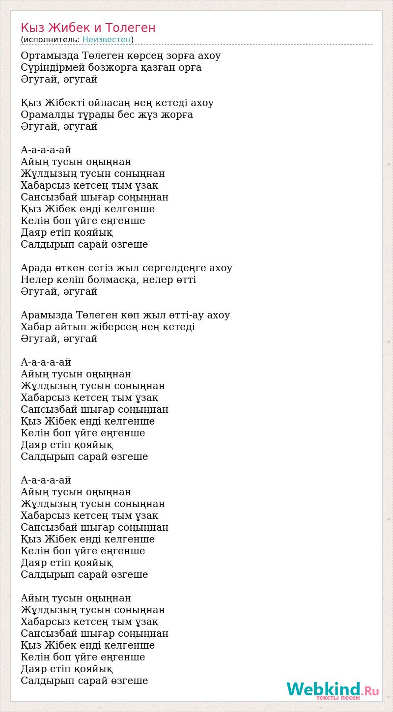 Ортамызда Төлеген көрсең зорға ахоу Сүріндірмей бозжорға қазған орға Әгугай, әгугай Қыз Жібекті ойласаң нең кетеді ахоу Орамалды тұрады бес жүз жорға Әгугай, әгугай А-а-а-а-ай Айың тусын оңыңнан Жұлдызың тусын соныңнан Хабарсыз кетсең тым ұзақ Сансызбай шығар соңыңнан Қыз Жібек енді келгенше Келін боп үйге еңгенше Даяр етіп қояйық Салдырып сарай өзгеше Арада өткен сегіз жыл сергелдеңге ахоу Нелер келіп болмасқа, нелер өтті Әгугай, әгугай Арамызда Төлеген көп жыл өтті-ау ахоу Хабар айтып жіберсең нең кетеді Әгугай, әгугай А-а-а-а-ай Айың тусын оңыңнан Жұлдызың тусын соныңнан Хабарсыз кетсең тым ұзақ Сансызбай шығар соңыңнан Қыз Жібек енді келгенше Келін боп үйге еңгенше Даяр етіп қояйық Салдырып сарай өзгеше А-а-а-а-ай Айың тусын оңыңнан Жұлдызың тусын соныңнан Хабарсыз кетсең тым ұзақ Сансызбай шығар соңыңнан Қыз Жібек енді келгенше Келін боп үйге еңгенше Даяр етіп қояйық Салдырып сарай өзгеше Айың тусын оңыңнан Жұлдызың тусын соныңнан Хабарсыз кетсең тым ұзақ Сансызбай шығар соңыңнан Қыз Жібек енді келгенше Келін боп үйге еңгенше Даяр етіп қояйық Салдырып сарай өзгеше