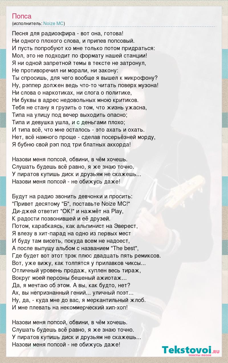 Песня для радиоэфира - вот она, готова! Ни одного плохого слова, и припев попсовый. И пусть попробуют ко мне только потом придраться: Мол, это не подходит по формату нашей станции! Я ни одной запретной темы в тексте не затронул, Не противоречил ни морали, ни закону: Ты спросишь, для чего вообще я вышел к микрофону? Ну, рэппер должен ведь что-то читать поверх музона! Ни слова о наркотиках, ни слога о политике, Ни буквы в адрес недовольных мною критиков. Тебя не стану я грузить о том, что жизнь ужасна, Типа на улицу под вечер выходить опасно; Типа и девушка ушла, и с деньгами плохо; И типа всё, что мне осталось - это ахать и охать. Нет, всё намного проще - сделав посерьёзней морду, Я бубню свой рэп под три блатных аккорда! Назови меня попсой, обвини, в чём хочешь. Слушать будешь всё равно, я же знаю точно. У пиратов купишь диск и друзьям не скажешь... Назови меня попсой - не обижусь даже! Будут на радио звонить девчонки и просить: "Привет десятому "Б", поставьте Noize MC!" Ди-джей ответит "ОК!" и нажмёт на Play, К радости позвонившей и её друзей. Потом, карабкаясь, как альпинист на Эверест, Я влезу в хит-парад на одно из первых мест И буду там висеть, покуда всем не надоест, А после выпущу альбом с названием "The best", Где будет вот этот трэк плюс двадцать пять ремиксов. Вот, уже вижу, как толпятся у прилавков чиксы... Отличный уровень продаж, куплен весь тираж, Вокруг моей персоны бешеный ажиотаж... Да, я мечтаю об этом. А вы, как будто, нет? Ах, вы непризнанный гений... уличный поэт... Ну, да, - куда мне до вас, я меркантильный жлоб. И мне плевать на некоммерческий хип-хоп! Назови меня попсой, обвини, в чём хочешь. Слушать будешь всё равно, я же знаю точно. У пиратов купишь диск и друзьям не скажешь... Назови меня попсой - не обижусь даже!
