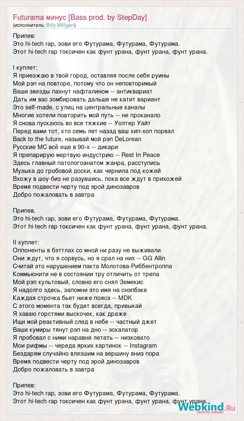 Припев: Это hi-tech rap, зови его Футурама, Футурама, Футурама. Этот hi-tech rap токсичен как фунт урана, фунт урана, фунт урана. I куплет: Я приезжаю в твой город, оставляя после себя руины Мой рэп на повторе, потому что он неповторимый Ваши звезды пахнут нафталином -- антиквариат Дать им вас зомбировать дальше не катит вариант Это self-made, с улиц на центральные каналы Многие хотели повторить мой путь -- не проканало Я снова пускаюсь во все тяжкие -- Уолтер Уайт Перед вами тот, кто семь лет назад ваш хип-хоп порвал Back to the future, называй мой рэп DeLorean Русские MC всё еще в 90-х -- дикари Я препарирую мертвую индустрию -- Rest In Peace Здесь главный патологоанатом жанра, расступись Музыка до гробовой доски, как чернила под кожей Вхожу в шоу-биз не разувшись, пока все ждут в прихожей Время подвести черту под эрой динозавров Добро пожаловать в завтра Припев. Это hi-tech rap, зови его Футурама, Футурама, Футурама. Этот hi-tech rap токсичен как фунт урана, фунт урана, фунт урана. II куплет: Оппоненты в бэттлах со мной ни разу не выживали Они ждут, что я сорвусь, но я срал на них -- GG Allin Считай это нарушением пакта Молотова-Риббентроппа Коммьюнити не в состоянии тру отличить от трепа Мой рэп культовый, словно его снял Земекис Я надолго здесь, запомни это имя на снэпбэке Каждая строчка бьет ниже пояса -- MDK С этого момента так будет всегда, привыкай Я хаваю горстями выскочек, как драже Ищи мой реактивный след в небе -- частный джет Ваши кумиры тянут рэп на дно -- эскалатор Я пробовал с ними наравне летать -- низковато Мои рифмы -- череда ярких картинок -- Instagram Бездарям случайно влезшим на вершину вниз пора Время подвести черту под эрой динозавров Добро пожаловать в завтра Припев: Это hi-tech rap, зови его Футурама, Футурама, Футурама. Этот hi-tech rap токсичен как фунт урана, фунт урана, фунт урана.