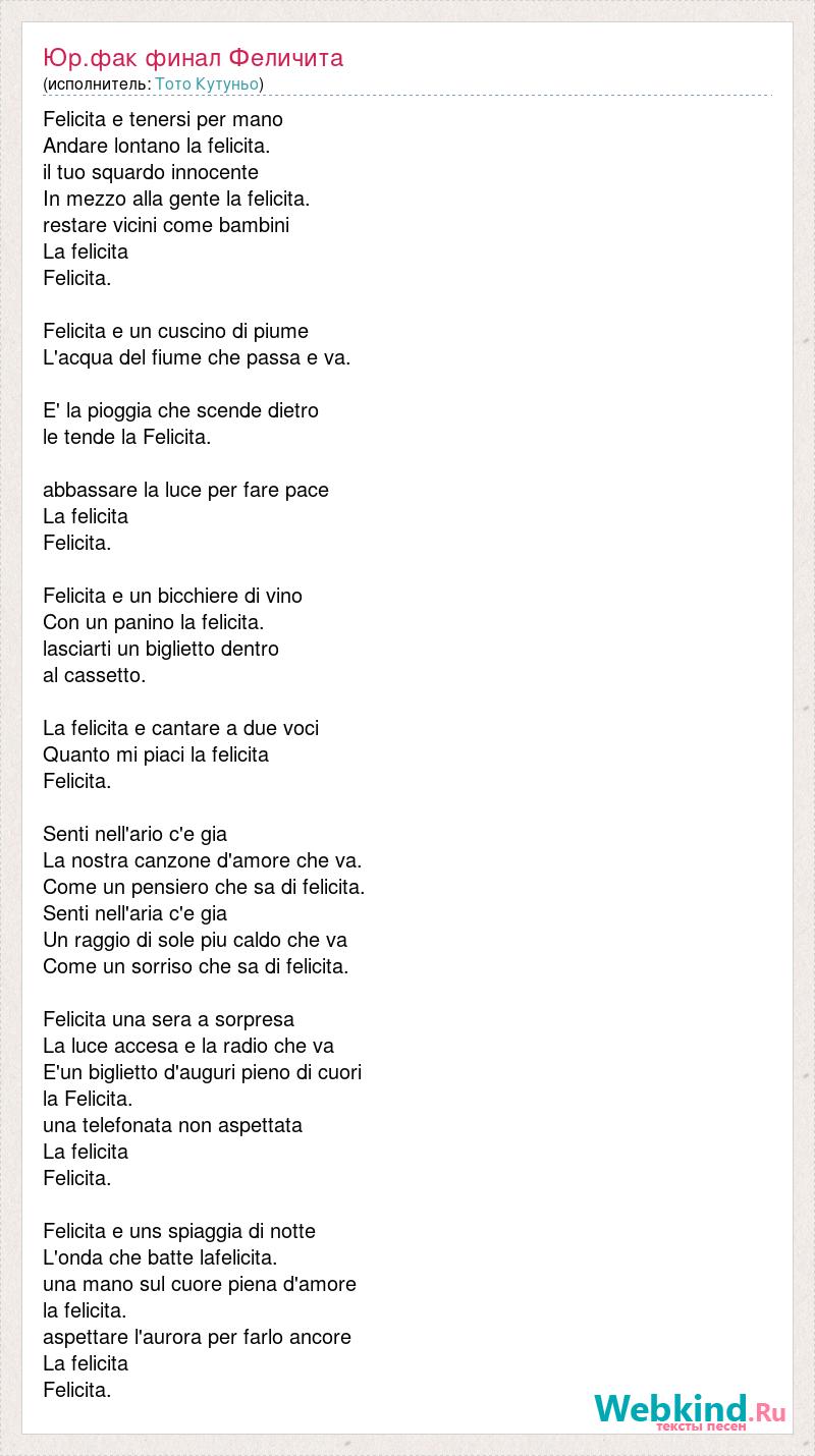 Felicita e tenersi per mano Andare lontano la felicita. il tuo squardo innocente In mezzo alla gente la felicita. restare vicini come bambini La felicita Felicita. Felicita e un cuscino di piume L'acqua del fiume che passa e va. E' la pioggia che scende dietro le tende la Felicita. abbassare la luce per fare pace La felicita Felicita. Felicita e un bicchiere di vino Con un panino la felicita. lasciarti un biglietto dentro al cassetto. La felicita e cantare a due voci Quanto mi piaci la felicita Felicita. Senti nell'ario c'e gia La nostra canzone d'amore che va. Come un pensiero che sa di felicita. Senti nell'aria c'e gia Un raggio di sole piu caldo che va Come un sorriso che sa di felicita. Felicita una sera a sorpresa La luce accesa e la radio che va E'un biglietto d'auguri pieno di cuori la Felicita. una telefonata non aspettata La felicita Felicita. Felicita e uns spiaggia di notte L'onda che batte lafelicita. una mano sul cuore piena d'amore la felicita. aspettare l'aurora per farlo ancore La felicita Felicita.