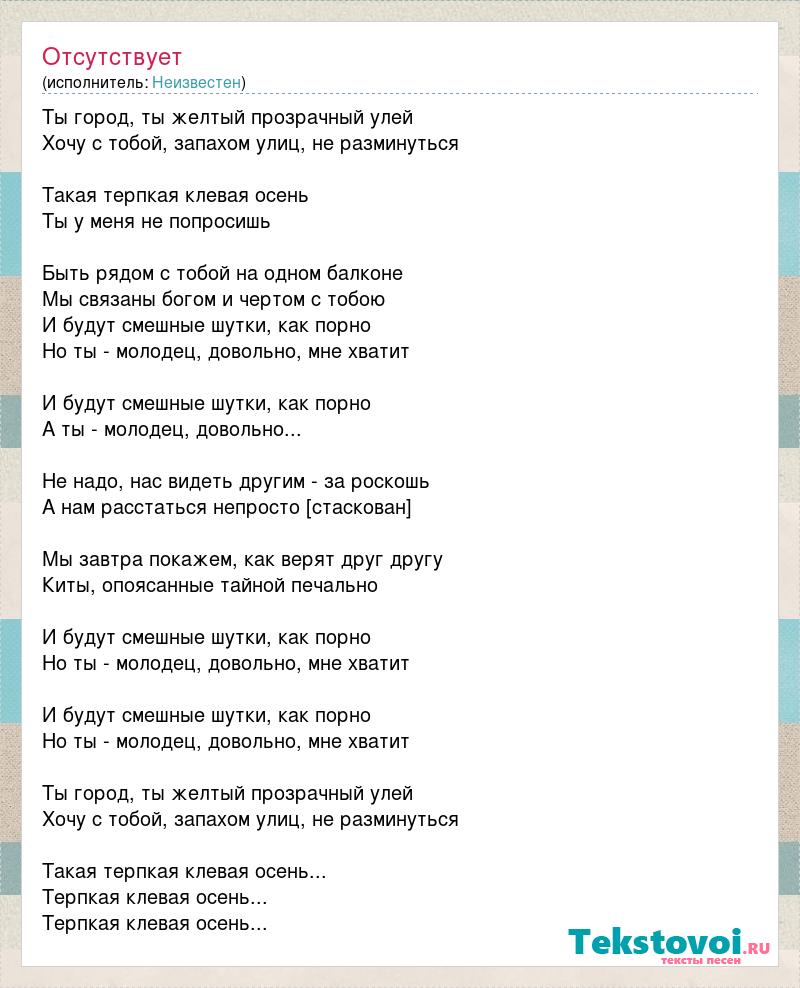 Ты город, ты желтый прозрачный улей Хочу с тобой, запахом улиц, не разминуться Такая терпкая клевая осень Ты у меня не попросишь Быть рядом с тобой на одном балконе Мы связаны богом и чертом с тобою И будут смешные шутки, как порно Но ты - молодец, довольно, мне хватит И будут смешные шутки, как порно А ты - молодец, довольно... Не надо, нас видеть другим - за роскошь А нам расстаться непросто [стаскован] Мы завтра покажем, как верят друг другу Киты, опоясанные тайной печально И будут смешные шутки, как порно Но ты - молодец, довольно, мне хватит И будут смешные шутки, как порно Но ты - молодец, довольно, мне хватит Ты город, ты желтый прозрачный улей Хочу с тобой, запахом улиц, не разминуться Такая терпкая клевая осень... Терпкая клевая осень... Терпкая клевая осень...
