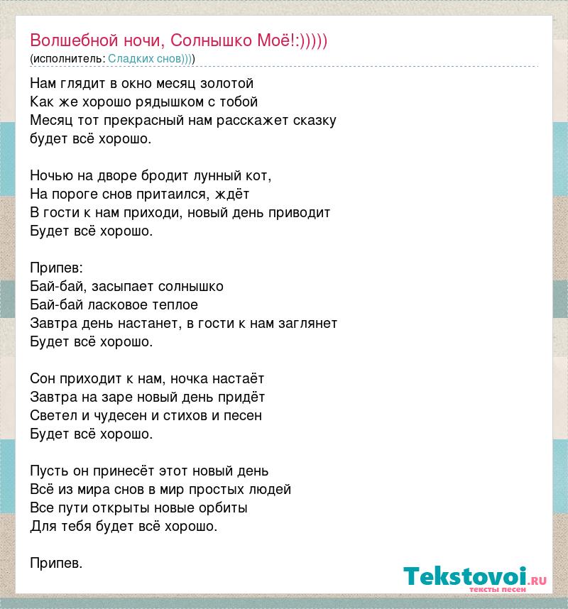 Нам глядит в окно месяц золотой Как же хорошо рядышком с тобой Месяц тот прекрасный нам расскажет сказку будет всё хорошо. Ночью на дворе бродит лунный кот, На пороге снов притаился, ждёт В гости к нам приходи, новый день приводит Будет всё хорошо. Припев: Бай-бай, засыпает солнышко Бай-бай ласковое теплое Завтра день настанет, в гости к нам заглянет Будет всё хорошо. Сон приходит к нам, ночка настаёт Завтра на заре новый день придёт Светел и чудесен и стихов и песен Будет всё хорошо. Пусть он принесёт этот новый день Всё из мира снов в мир простых людей Все пути открыты новые орбиты Для тебя будет всё хорошо. Припев.