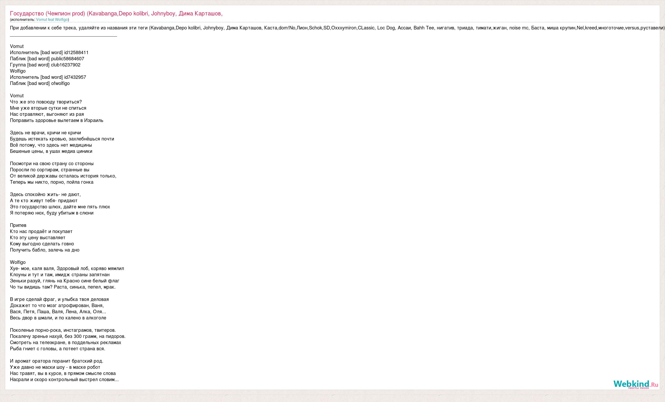 Главная→Исполнители→Vomut feat Wolfigo→Государство (Чемпион prod) (Kavabanga,Depo kolibri, Johnyboy, Дима Карташов,