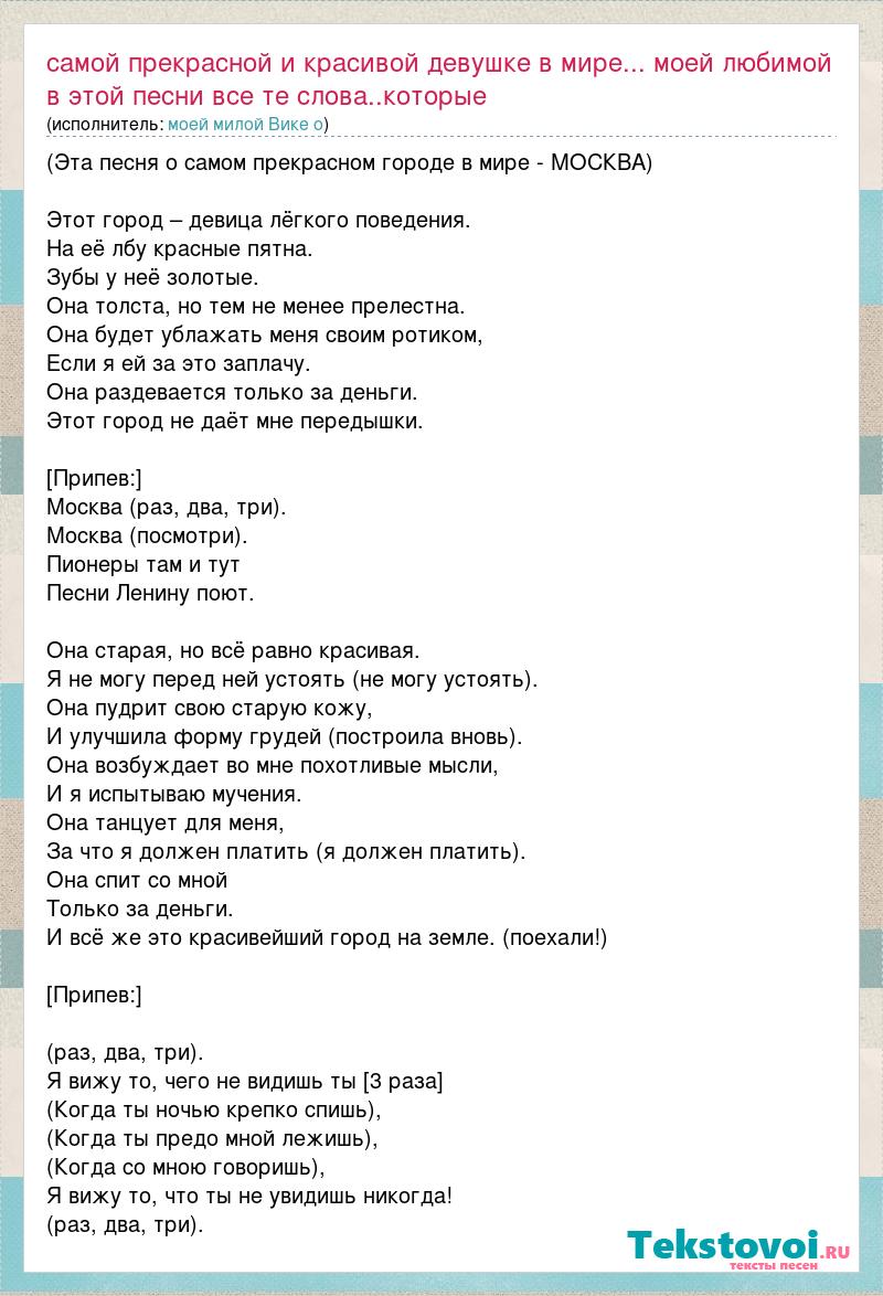 (Эта песня о самом прекрасном городе в мире - МОСКВА) Этот город – девица лёгкого поведения. На её лбу красные пятна. Зубы у неё золотые. Она толста, но тем не менее прелестна. Она будет ублажать меня своим ротиком, Если я ей за это заплачу. Она раздевается только за деньги. Этот город не даёт мне передышки. [Припев:] Москва (раз, два, три). Москва (посмотри). Пионеры там и тут Песни Ленину поют. Она старая, но всё равно красивая. Я не могу перед ней устоять (не могу устоять). Она пудрит свою старую кожу, И улучшила форму грудей (построила вновь). Она возбуждает во мне похотливые мысли, И я испытываю мучения. Она танцует для меня, За что я должен платить (я должен платить). Она спит со мной Только за деньги. И всё же это красивейший город на земле. (поехали!) [Припев:] (раз, два, три). Я вижу то, чего не видишь ты [3 раза] (Когда ты ночью крепко спишь), (Когда ты предо мной лежишь), (Когда со мною говоришь), Я вижу то, что ты не увидишь никогда! (раз, два, три).