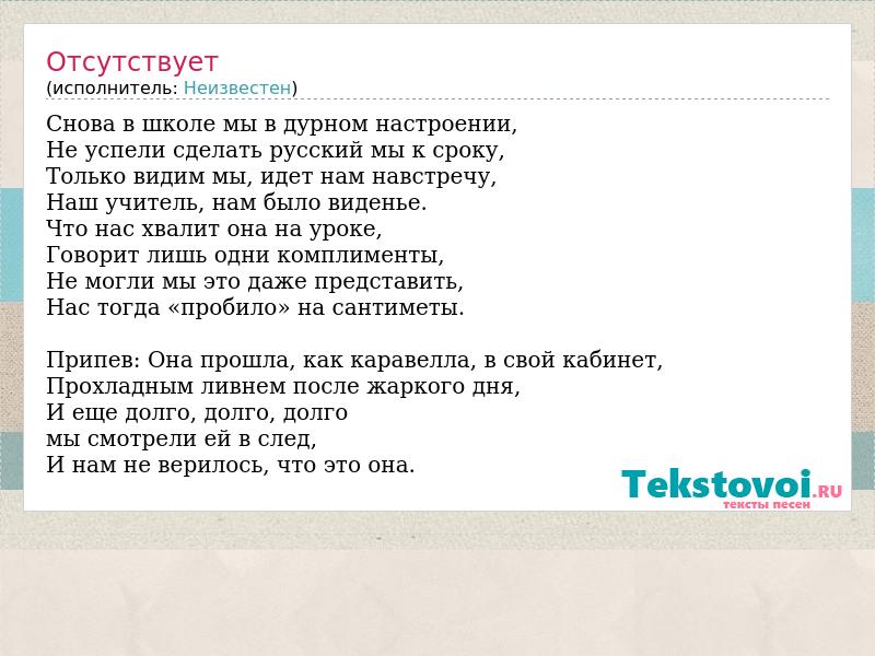 Снова в школе мы в дурном настроении, Не успели сделать русский мы к сроку, Только видим мы, идет нам навстречу, Наш учитель, нам было виденье. Что нас хвалит она на уроке, Говорит лишь одни комплименты, Не могли мы это даже представить, Нас тогда «пробило» на сантиметы. Припев: Она прошла, как каравелла, в свой кабинет, Прохладным ливнем после жаркого дня, И еще долго, долго, долго мы смотрели ей в след, И нам не верилось, что это она.