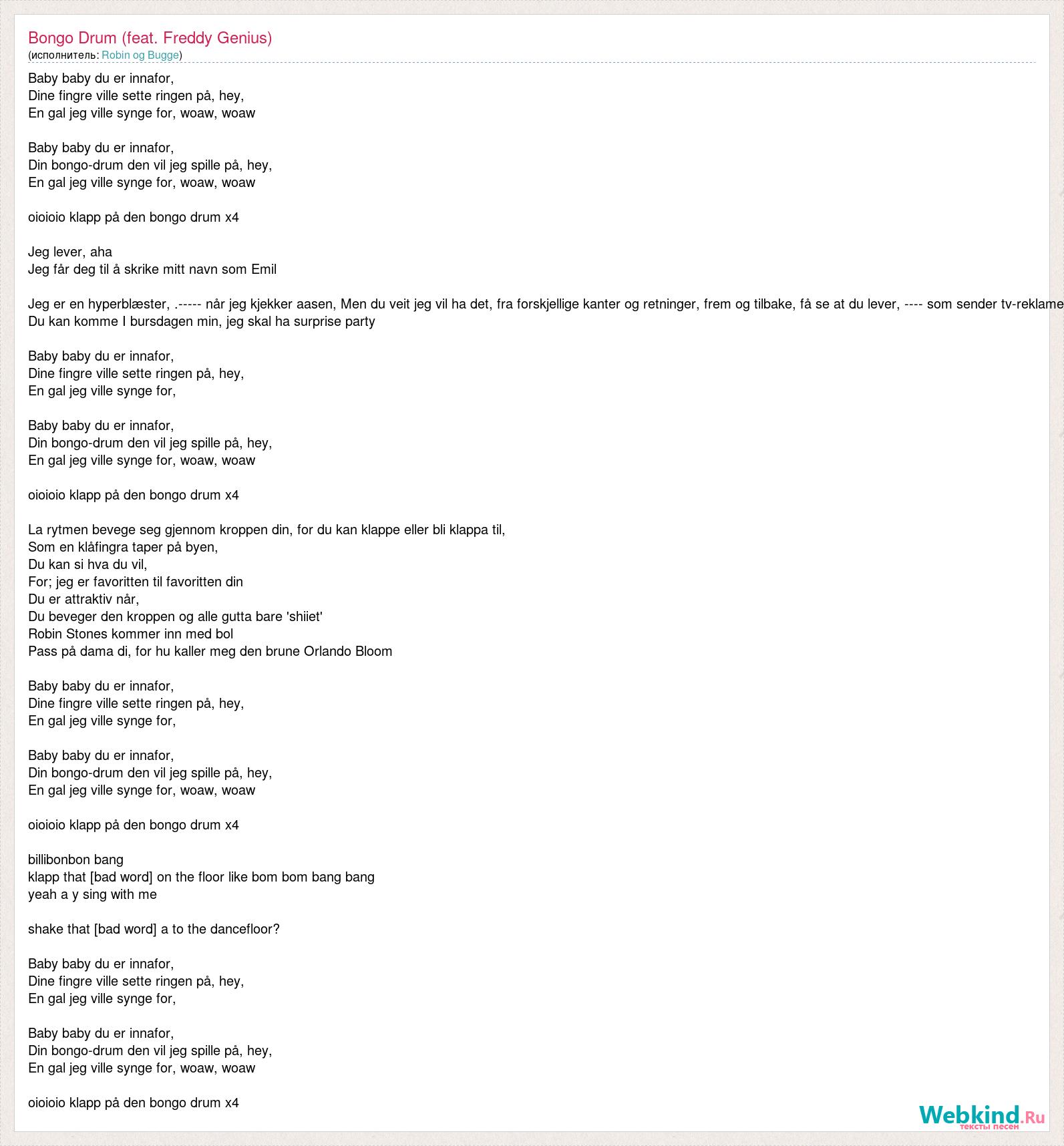 Baby baby du er innafor, Dine fingre ville sette ringen på, hey, En gal jeg ville synge for, woaw, woaw Baby baby du er innafor, Din bongo-drum den vil jeg spille på, hey, En gal jeg ville synge for, woaw, woaw oioioio klapp på den bongo drum x4 Jeg lever, aha Jeg får deg til å skrike mitt navn som Emil Jeg er en hyperblæster, .----- når jeg kjekker aasen, Men du veit jeg vil ha det, fra forskjellige kanter og retninger, frem og tilbake, få se at du lever, ---- som sender tv-reklame Du kan komme I bursdagen min, jeg skal ha surprise party Baby baby du er innafor, Dine fingre ville sette ringen på, hey, En gal jeg ville synge for, Baby baby du er innafor, Din bongo-drum den vil jeg spille på, hey, En gal jeg ville synge for, woaw, woaw oioioio klapp på den bongo drum x4 La rytmen bevege seg gjennom kroppen din, for du kan klappe eller bli klappa til, Som en klåfingra taper på byen, Du kan si hva du vil, For; jeg er favoritten til favoritten din Du er attraktiv når, Du beveger den kroppen og alle gutta bare 'shiiet' Robin Stones kommer inn med bol Pass på dama di, for hu kaller meg den brune Orlando Bloom Baby baby du er innafor, Dine fingre ville sette ringen på, hey, En gal jeg ville synge for, Baby baby du er innafor, Din bongo-drum den vil jeg spille på, hey, En gal jeg ville synge for, woaw, woaw oioioio klapp på den bongo drum x4 billibonbon bang klapp that [bad word] on the floor like bom bom bang bang yeah a y sing with me shake that [bad word] a to the dancefloor? Baby baby du er innafor, Dine fingre ville sette ringen på, hey, En gal jeg ville synge for, Baby baby du er innafor, Din bongo-drum den vil jeg spille på, hey, En gal jeg ville synge for, woaw, woaw oioioio klapp på den bongo drum x4