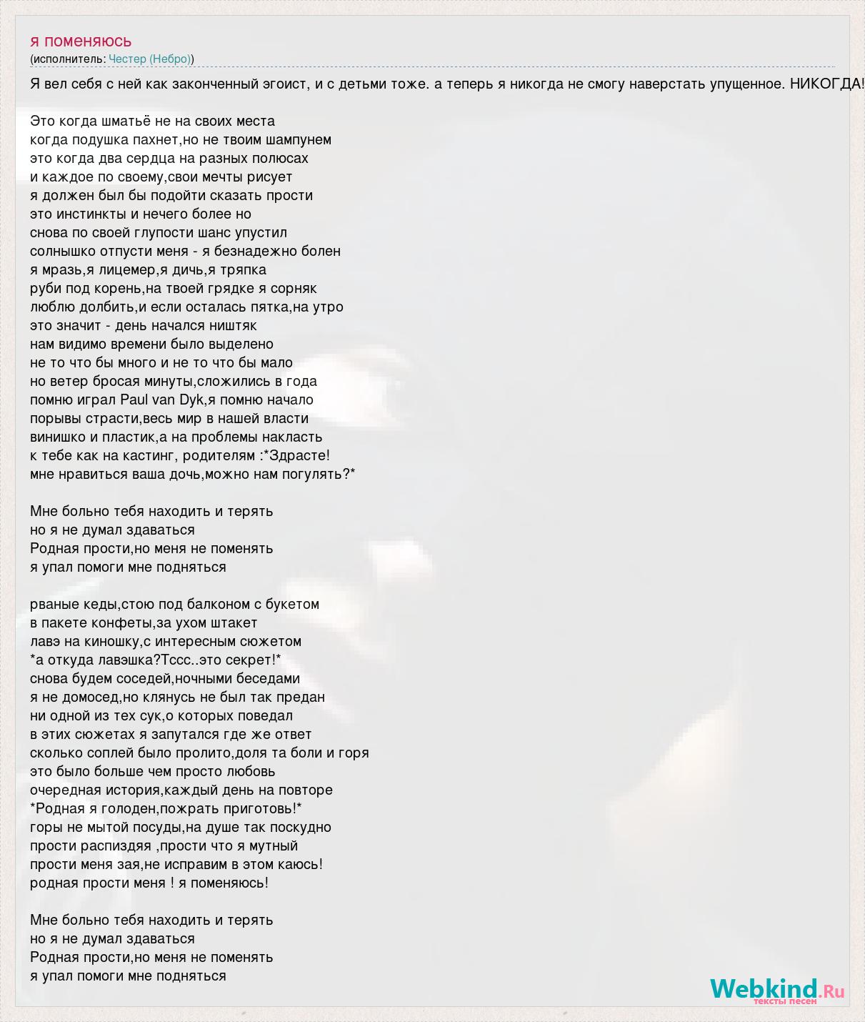 Я вел себя с ней как законченный эгоист, и с детьми тоже. а теперь я никогда не смогу наверстать упущенное. НИКОГДА! Это когда шматьё не на своих места когда подушка пахнет,но не твоим шампунем это когда два сердца на разных полюсах и каждое по своему,свои мечты рисует я должен был бы подойти сказать прости это инстинкты и нечего более но снова по своей глупости шанс упустил солнышко отпусти меня - я безнадежно болен я мразь,я лицемер,я дичь,я тряпка руби под корень,на твоей грядке я сорняк люблю долбить,и если осталась пятка,на утро это значит - день начался ништяк нам видимо времени было выделено не то что бы много и не то что бы мало но ветер бросая минуты,сложились в года помню играл Paul van Dyk,я помню начало порывы страсти,весь мир в нашей власти винишко и пластик,а на проблемы накласть к тебе как на кастинг, родителям :*Здрасте! мне нравиться ваша дочь,можно нам погулять?* Мне больно тебя находить и терять но я не думал здаваться Родная прости,но меня не поменять я упал помоги мне подняться рваные кеды,стою под балконом с букетом в пакете конфеты,за ухом штакет лавэ на киношку,с интересным сюжетом *а откуда лавэшка?Тссс..это секрет!* снова будем соседей,ночными беседами я не домосед,но клянусь не был так предан ни одной из тех сук,о которых поведал в этих сюжетах я запутался где же ответ сколько соплей было пролито,доля та боли и горя это было больше чем просто любовь очередная история,каждый день на повторе *Родная я голоден,пожрать приготовь!* горы не мытой посуды,на душе так поскудно прости распиздяя ,прости что я мутный прости меня зая,не исправим в этом каюсь! родная прости меня ! я поменяюсь! Мне больно тебя находить и терять но я не думал здаваться Родная прости,но меня не поменять я упал помоги мне подняться