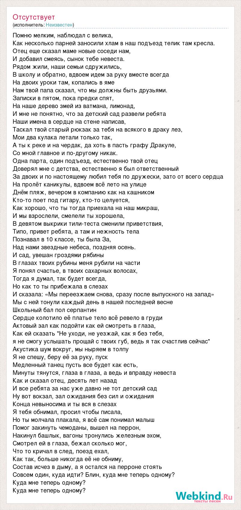 Помню мелким, наблюдал с велика, Как несколько парней заносили хлам в наш подъезд телик там кресла. Отец еще сказал маме новые соседи нам, И добавил смеясь, сынок тебе невеста. Рядом жили, наши семьи сдружились, В школу и обратно, вдвоем идем за руку вместе всегда На двоих уроки там, копались в яме Нам твой папа сказал, что мы должны быть друзьями. Записки в пятом, пока предки спят, На наше дерево змей из ватмана, лимонад, И мне не понятно, что за детский сад развели ребята Наши имена в сердце на стене написав, Таскал твой старый рюкзак за тебя на всякого в драку лез, Мои два кулака летали только так, А ты к реке и на чердак, да хоть в пасть графу Дракуле, Со мной главное и по-другому никак. Одна парта, один подъезд, естественно твой отец Доверял мне с детства, естественно я был ответственный За двоих и по настоящему любил тебя по дружески, зато от всего сердца На пролёт каникулы, вдвоем всё лето на улице Днём пляж, вечером в компанию как на кашником Кто-то поет под гитару, кто-то целуется, Как хорошо, что ты тогда приехала на наш микраш, И мы взрослели, смелели ты хорошела, В девятом выкрики тили-теста сменили приветствия, Типо, привет ребята, а там и нежность тела Познавал в 10 классе, ты была За, Над нами звездные небеса, поздняя осень. И сад, увешан гроздями рябины В глазах твоих рубины меня рубили на части Я понял счастье, в твоих сахарных волосах, Тогда я думал, так будет всегда, Но как то ты прибежала в слезах И сказала: «Мы переезжаем снова, сразу после выпускного на запад» Мы с ней тонули каждый день в нашей последней весне Школьный бал пол серпантин Сердце колотило её платье тело всё ревело в груди Актовый зал как подойти как ей смотреть в глаза, Как ей сказать "Не уходи, не уезжай, как я без тебя, я не смогу услышать прощай с твоих губ, ведь я так счастлив сейчас" Акустика шум вокруг, мы ныряем в толпу Я не спешу, беру её за руку, пуск Медленный танец пусть все будет как есть, Минуты тянутся, глаза в глаза, а ведь и вправду невеста Как и сказал отец, десять лет назад И все ребята за нас уже давно не тот детский сад Ну вот вокзал, зал ожидания без сил и ожидания Конца невыносима и ты вся в слезах Я тебя обнимал, просил чтобы писала, Но ты молчала плакала, я всё сам понимал малыш Помог закинуть чемоданы, вышел на перрон, Накинул башлык, вагоны тронулись железным эхом, Смотрел ей в глаза, бежал сколько мог, Что то кричал в след, поезд ехал, Как так, больше никогда её не обниму, Состав исчез в дыму, а я остался на перроне стоять Совсем один, куда идти? Блин, куда мне теперь одному? Куда мне теперь одному? Куда мне теперь одному?