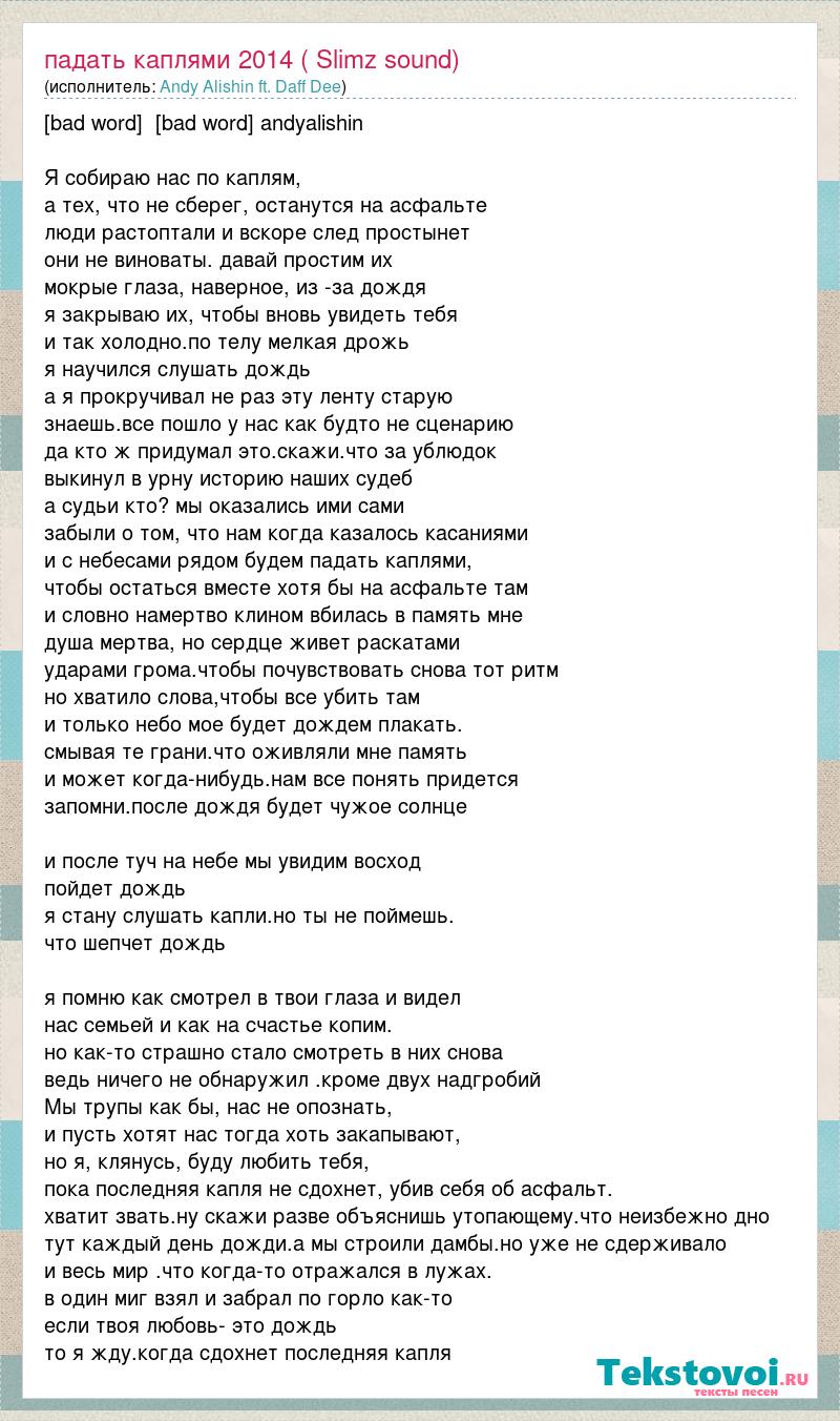 [bad word] [bad word] andyalishin Я собираю нас по каплям, а тех, что не сберег, останутся на асфальте люди растоптали и вскоре след простынет они не виноваты. давай простим их мокрые глаза, наверное, из -за дождя я закрываю их, чтобы вновь увидеть тебя и так холодно.по телу мелкая дрожь я научился слушать дождь а я прокручивал не раз эту ленту старую знаешь.все пошло у нас как будто не сценарию да кто ж придумал это.скажи.что за ублюдок выкинул в урну историю наших судеб а судьи кто? мы оказались ими сами забыли о том, что нам когда казалось касаниями и с небесами рядом будем падать каплями, чтобы остаться вместе хотя бы на асфальте там и словно намертво клином вбилась в память мне душа мертва, но сердце живет раскатами ударами грома.чтобы почувствовать снова тот ритм но хватило слова,чтобы все убить там и только небо мое будет дождем плакать. смывая те грани.что оживляли мне память и может когда-нибудь.нам все понять придется запомни.после дождя будет чужое солнце и после туч на небе мы увидим восход пойдет дождь я стану слушать капли.но ты не поймешь. что шепчет дождь я помню как смотрел в твои глаза и видел нас семьей и как на счастье копим. но как-то страшно стало смотреть в них снова ведь ничего не обнаружил .кроме двух надгробий Мы трупы как бы, нас не опознать, и пусть хотят нас тогда хоть закапывают, но я, клянусь, буду любить тебя, пока последняя капля не сдохнет, убив себя об асфальт. хватит звать.ну скажи разве объяснишь утопающему.что неизбежно дно тут каждый день дожди.а мы строили дамбы.но уже не сдерживало и весь мир .что когда-то отражался в лужах. в один миг взял и забрал по горло как-то если твоя любовь- это дождь то я жду.когда сдохнет последняя капля