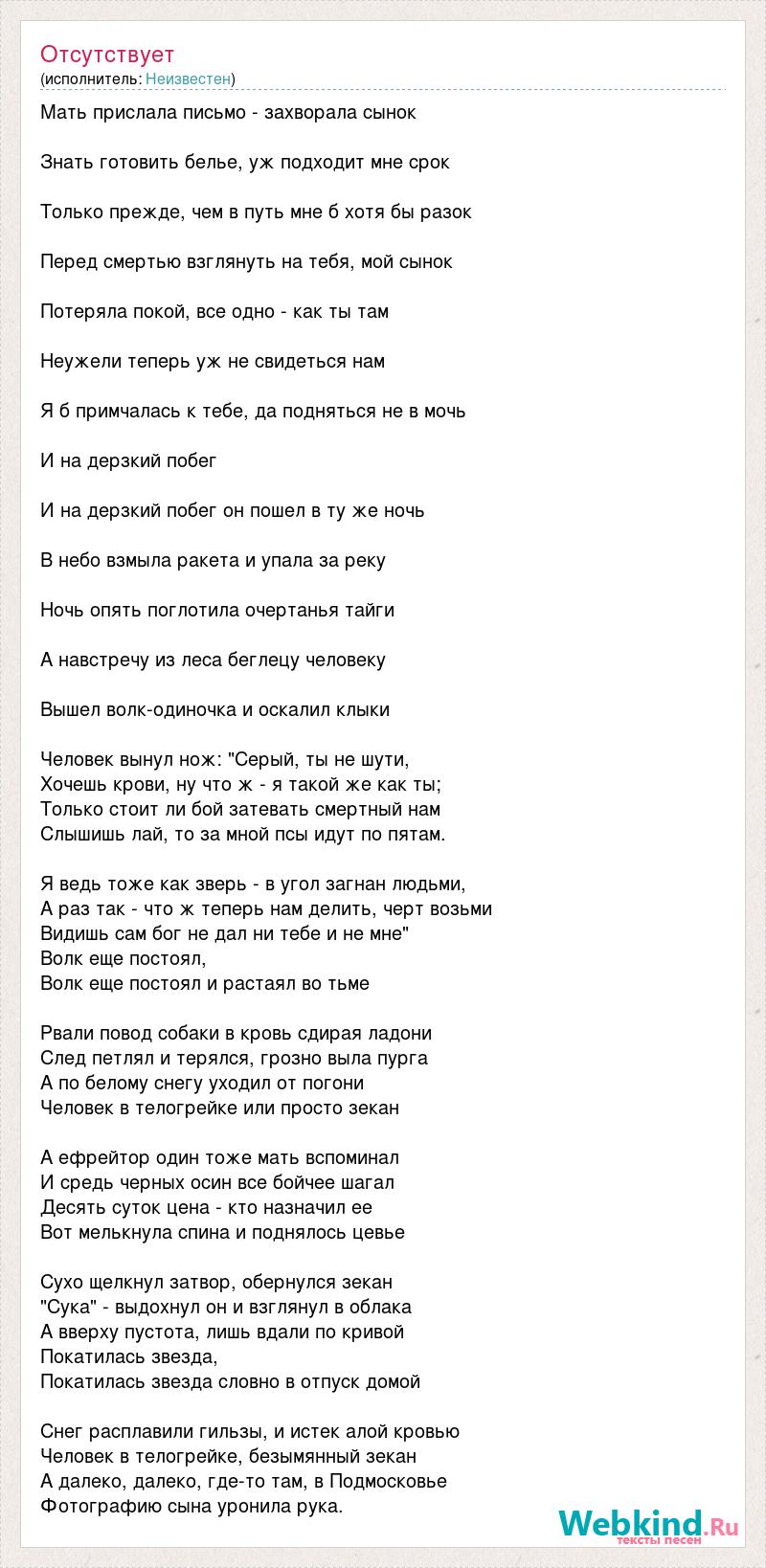 Мать прислала письмо - захворала сынок Знать готовить белье, уж подходит мне срок Только прежде, чем в путь мне б хотя бы разок Перед смертью взглянуть на тебя, мой сынок Потеряла покой, все одно - как ты там Неужели теперь уж не свидеться нам Я б примчалась к тебе, да подняться не в мочь И на дерзкий побег И на дерзкий побег он пошел в ту же ночь В небо взмыла ракета и упала за реку Ночь опять поглотила очертанья тайги А навстречу из леса беглецу человеку Вышел волк-одиночка и оскалил клыки Человек вынул нож: "Серый, ты не шути, Хочешь крови, ну что ж - я такой же как ты; Только стоит ли бой затевать смертный нам Слышишь лай, то за мной псы идут по пятам. Я ведь тоже как зверь - в угол загнан людьми, А раз так - что ж теперь нам делить, черт возьми Видишь сам бог не дал ни тебе и не мне" Волк еще постоял, Волк еще постоял и растаял во тьме Рвали повод собаки в кровь сдирая ладони След петлял и терялся, грозно выла пурга А по белому снегу уходил от погони Человек в телогрейке или просто зекан А ефрейтор один тоже мать вспоминал И средь черных осин все бойчее шагал Десять суток цена - кто назначил ее Вот мелькнула спина и поднялось цевье Сухо щелкнул затвор, обернулся зекан "Сука" - выдохнул он и взглянул в облака А вверху пустота, лишь вдали по кривой Покатилась звезда, Покатилась звезда словно в отпуск домой Снег расплавили гильзы, и истек алой кровью Человек в телогрейке, безымянный зекан А далеко, далеко, где-то там, в Подмосковье Фотографию сына уронила рука.