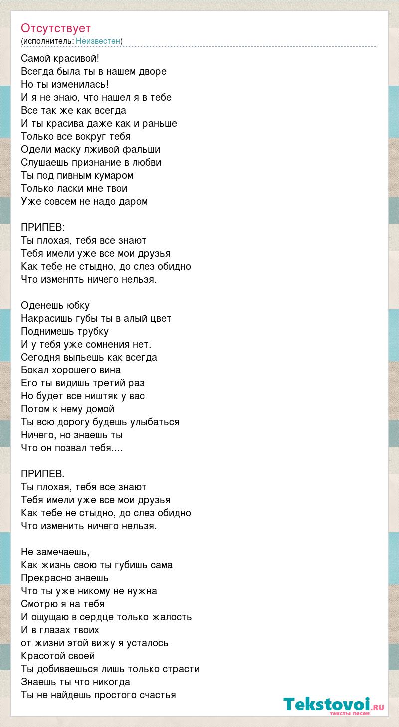 Самой красивой! Всегда была ты в нашем дворе Но ты изменилась! И я не знаю, что нашел я в тебе Все так же как всегда И ты красива даже как и раньше Только все вокруг тебя Одели маску лживой фальши Слушаешь признание в любви Ты под пивным кумаром Только ласки мне твои Уже совсем не надо даром ПРИПЕВ: Ты плохая, тебя все знают Тебя имели уже все мои друзья Как тебе не стыдно, до слез обидно Что изменпть ничего нельзя. Оденешь юбку Накрасишь губы ты в алый цвет Поднимешь трубку И у тебя уже сомнения нет. Сегодня выпьешь как всегда Бокал хорошего вина Его ты видишь третий раз Но будет все ништяк у вас Потом к нему домой Ты всю дорогу будешь улыбаться Ничего, но знаешь ты Что он позвал тебя.... ПРИПЕВ. Ты плохая, тебя все знают Тебя имели уже все мои друзья Как тебе не стыдно, до слез обидно Что изменить ничего нельзя. Не замечаешь, Как жизнь свою ты губишь сама Прекрасно знаешь Что ты уже никому не нужна Смотрю я на тебя И ощущаю в сердце только жалость И в глазах твоих от жизни этой вижу я усталось Красотой своей Ты добиваешься лишь только страсти Знаешь ты что никогда Ты не найдешь простого счастья