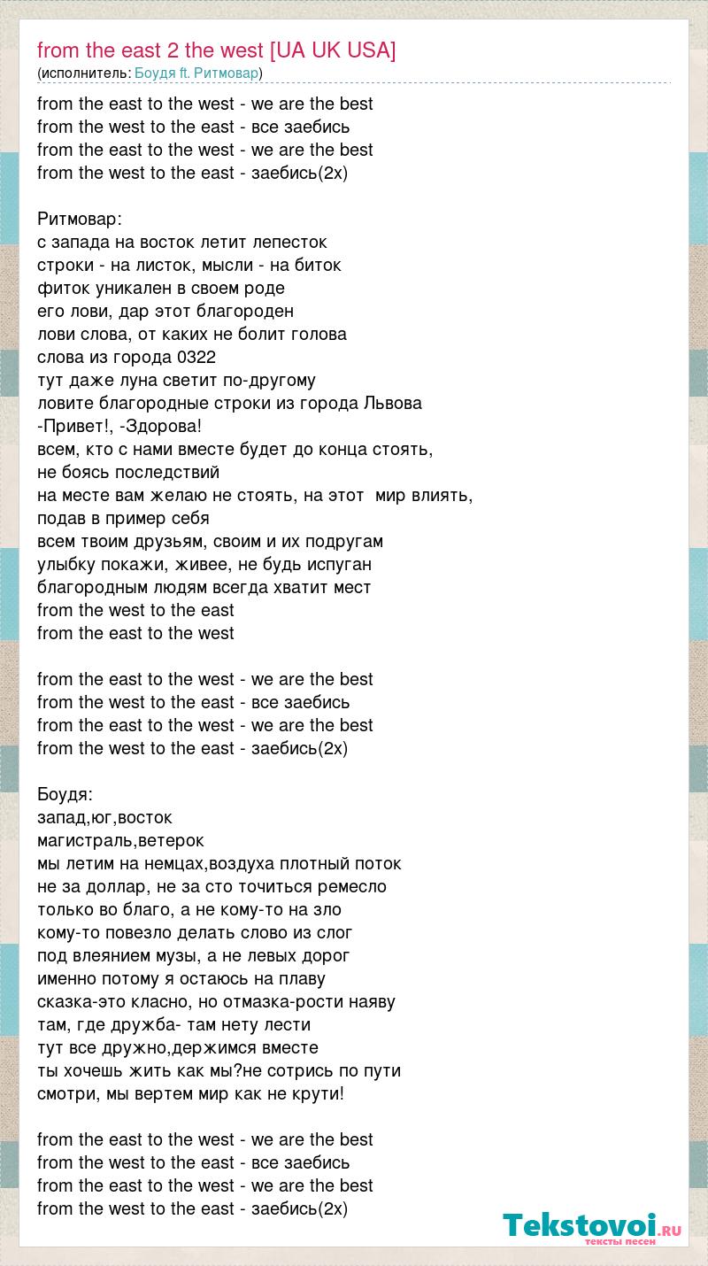 from the east to the west - we are the best from the west to the east - все заебись from the east to the west - we are the best from the west to the east - заебись(2х) Ритмовар: с запада на восток летит лепесток строки - на листок, мысли - на биток фиток уникален в своем роде его лови, дар этот благороден лови слова, от каких не болит голова слова из города 0322 тут даже луна светит по-другому ловите благородные строки из города Львова -Привет!, -Здорова! всем, кто с нами вместе будет до конца стоять, не боясь последствий на месте вам желаю не стоять, на этот мир влиять, подав в пример себя всем твоим друзьям, своим и их подругам улыбку покажи, живее, не будь испуган благородным людям всегда хватит мест from the west to the east from the east to the west from the east to the west - we are the best from the west to the east - все заебись from the east to the west - we are the best from the west to the east - заебись(2х) Боудя: запад,юг,восток магистраль,ветерок мы летим на немцах,воздуха плотный поток не за доллар, не за сто точиться ремесло только во благо, а не кому-то на зло кому-то повезло делать слово из слог под влеянием музы, а не левых дорог именно потому я остаюсь на плаву сказка-это класно, но отмазка-рости наяву там, где дружба- там нету лести тут все дружно,держимся вместе ты хочешь жить как мы?не сотрись по пути смотри, мы вертем мир как не крути! from the east to the west - we are the best from the west to the east - все заебись from the east to the west - we are the best from the west to the east - заебись(2х)