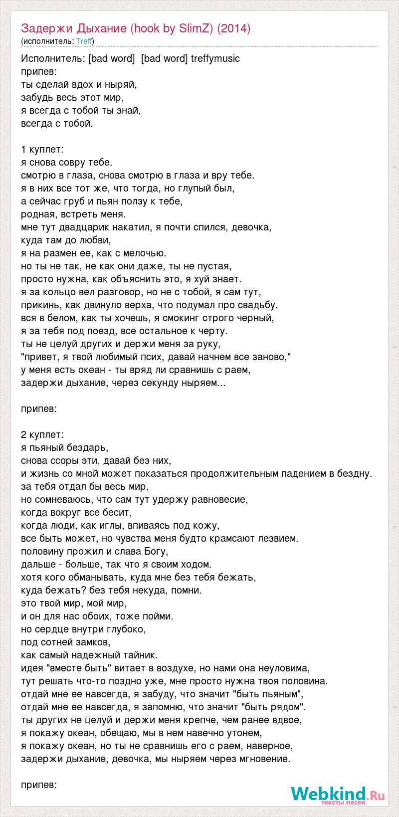 Исполнитель: [bad word] [bad word] treffymusic припев: ты сделай вдох и ныряй, забудь весь этот мир, я всегда с тобой ты знай, всегда с тобой. 1 куплет: я снова совру тебе. смотрю в глаза, снова смотрю в глаза и вру тебе. я в них все тот же, что тогда, но глупый был, а сейчас груб и пьян ползу к тебе, родная, встреть меня. мне тут двадцарик накатил, я почти спился, девочка, куда там до любви, я на размен ее, как с мелочью. но ты не так, не как они даже, ты не пустая, просто нужна, как объяснить это, я хуй знает. я за кольцо вел разговор, но не с тобой, я сам тут, прикинь, как двинуло верха, что подумал про свадьбу. вся в белом, как ты хочешь, я смокинг строго черный, я за тебя под поезд, все остальное к черту. ты не целуй других и держи меня за руку, "привет, я твой любимый псих, давай начнем все заново," у меня есть океан - ты вряд ли сравнишь с раем, задержи дыхание, через секунду ныряем... припев: 2 куплет: я пьяный бездарь, снова ссоры эти, давай без них, и жизнь со мной может показаться продолжительным падением в бездну. за тебя отдал бы весь мир, но сомневаюсь, что сам тут удержу равновесие, когда вокруг все бесит, когда люди, как иглы, впиваясь под кожу, все быть может, но чувства меня будто крамсают лезвием. половину прожил и слава Богу, дальше - больше, так что я своим ходом. хотя кого обманывать, куда мне без тебя бежать, куда бежать? без тебя некуда, помни. это твой мир, мой мир, и он для нас обоих, тоже пойми. но сердце внутри глубоко, под сотней замков, как самый надежный тайник. идея "вместе быть" витает в воздухе, но нами она неуловима, тут решать что-то поздно уже, мне просто нужна твоя половина. отдай мне ее навсегда, я забуду, что значит "быть пьяным", отдай мне ее навсегда, я запомню, что значит "быть рядом". ты других не целуй и держи меня крепче, чем ранее вдвое, я покажу океан, обещаю, мы в нем навечно утонем, я покажу океан, но ты не сравнишь его с раем, наверное, задержи дыхание, девочка, мы ныряем через мгновение. припев: