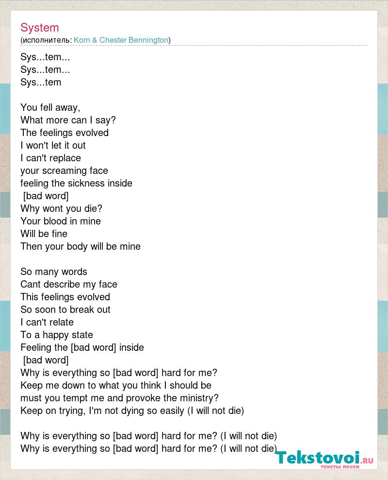 Sys...tem... Sys...tem... Sys...tem You fell away, What more can I say? The feelings evolved I won't let it out I can't replace your screaming face feeling the sickness inside Chorus: Why wont you die? Your blood in mine Will be fine Then your body will be mine So many words Cant describe my face This feelings evolved So soon to break out I can't relate To a happy state Feeling the blood run inside Chorus Why is everything so [bad word] hard for me? Keep me down to what you think I should be must you tempt me and provoke the ministry? Keep on trying, I'm not dying so easily (I will not die) Why is everything so [bad word] hard for me? (I will not die) Why is everything so [bad word] hard for me? (I will not die)