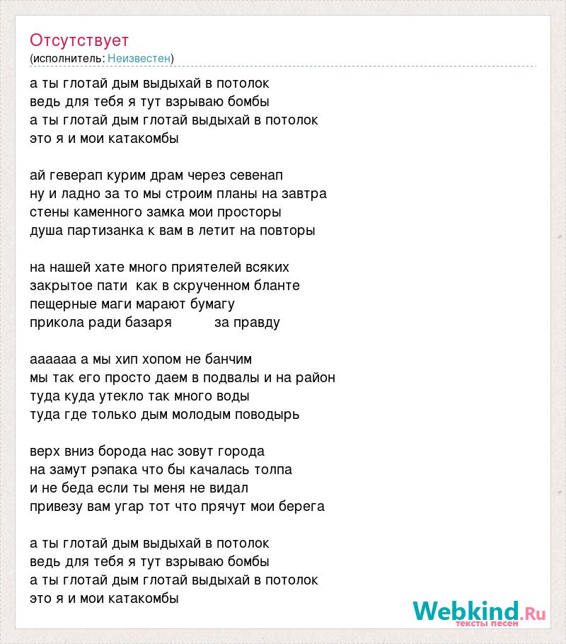 а ты глотай дым выдыхай в потолок ведь для тебя я тут взрываю бомбы а ты глотай дым глотай выдыхай в потолок это я и мои катакомбы ай геверап курим драм через севенап ну и ладно за то мы строим планы на завтра стены каменного замка мои просторы душа партизанка к вам в летит на повторы на нашей хате много приятелей всяких закрытое пати как в скрученном бланте пещерные маги марают бумагу прикола ради базаря за правду аааааа а мы хип хопом не банчим мы так его просто даем в подвалы и на район туда куда утекло так много воды туда где только дым молодым поводырь верх вниз борода нас зовут города на замут рэпака что бы качалась толпа и не беда если ты меня не видал привезу вам угар тот что прячут мои берега а ты глотай дым выдыхай в потолок ведь для тебя я тут взрываю бомбы а ты глотай дым глотай выдыхай в потолок это я и мои катакомбы