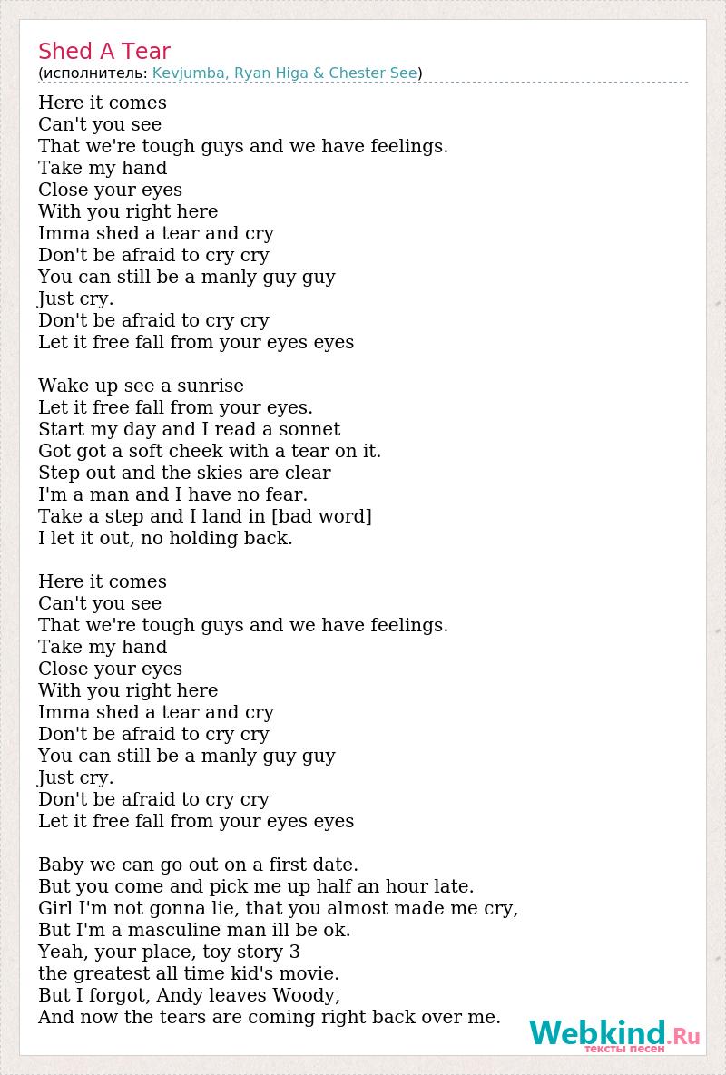 Here it comes Can't you see That we're tough guys and we have feelings. Take my hand Close your eyes With you right here Imma shed a tear and cry Don't be afraid to cry cry You can still be a manly guy guy Just cry. Don't be afraid to cry cry Let it free fall from your eyes eyes Wake up see a sunrise Let it free fall from your eyes. Start my day and I read a sonnet Got got a soft cheek with a tear on it. Step out and the skies are clear I'm a man and I have no fear. Take a step and I land in [bad word] I let it out, no holding back. Here it comes Can't you see That we're tough guys and we have feelings. Take my hand Close your eyes With you right here Imma shed a tear and cry Don't be afraid to cry cry You can still be a manly guy guy Just cry. Don't be afraid to cry cry Let it free fall from your eyes eyes Baby we can go out on a first date. But you come and pick me up half an hour late. Girl I'm not gonna lie, that you almost made me cry, But I'm a masculine man ill be ok. Yeah, your place, toy story 3 the greatest all time kid's movie. But I forgot, Andy leaves Woody, And now the tears are coming right back over me.
