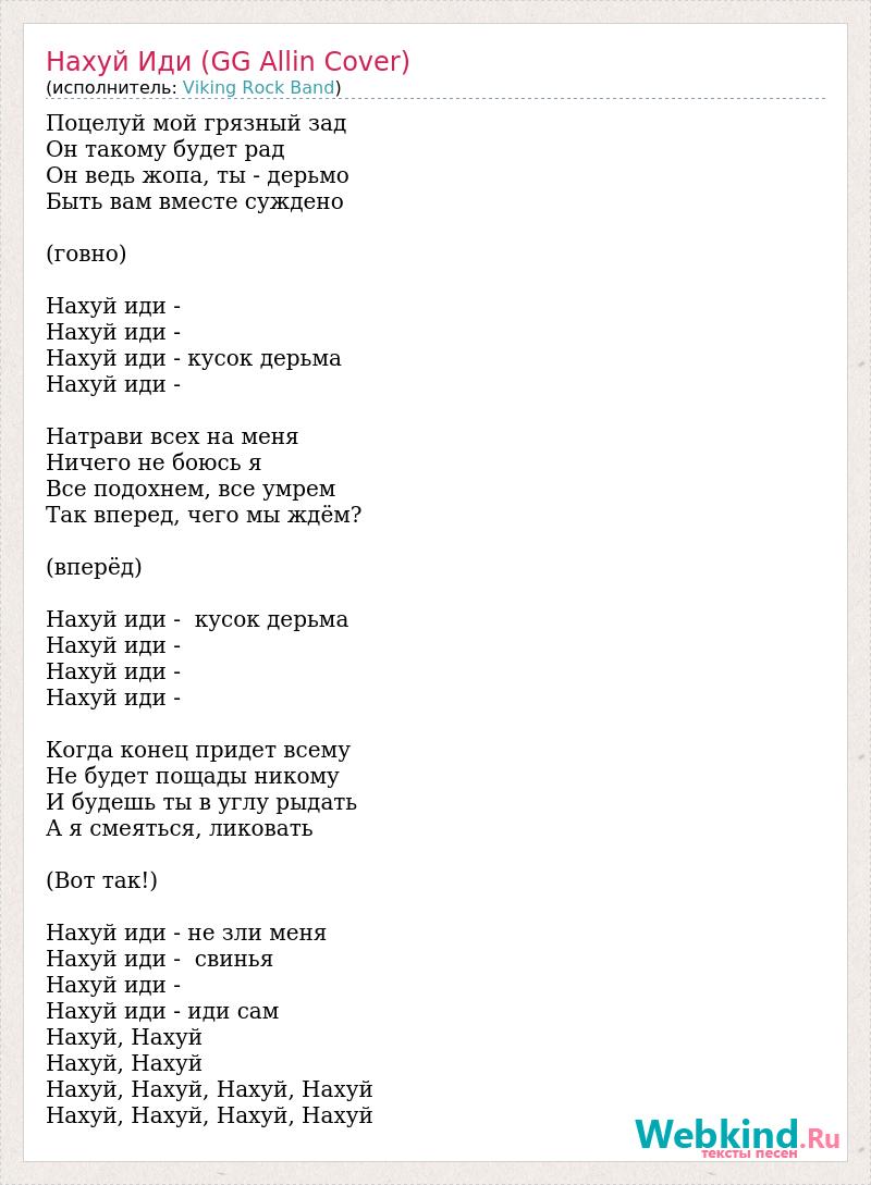 Поцелуй мой грязный зад Он такому будет рад Он ведь жопа, ты - дерьмо Быть вам вместе суждено (говно) Нахуй иди - Нахуй иди - Нахуй иди - кусок дерьма Нахуй иди - Натрави всех на меня Ничего не боюсь я Все подохнем, все умрем Так вперед, чего мы ждём? (вперёд) Нахуй иди - кусок дерьма Нахуй иди - Нахуй иди - Нахуй иди - Когда конец придет всему Не будет пощады никому И будешь ты в углу рыдать А я смеяться, ликовать (Вот так!) Нахуй иди - не зли меня Нахуй иди - свинья Нахуй иди - Нахуй иди - иди сам Нахуй, Нахуй Нахуй, Нахуй Нахуй, Нахуй, Нахуй, Нахуй Нахуй, Нахуй, Нахуй, Нахуй
