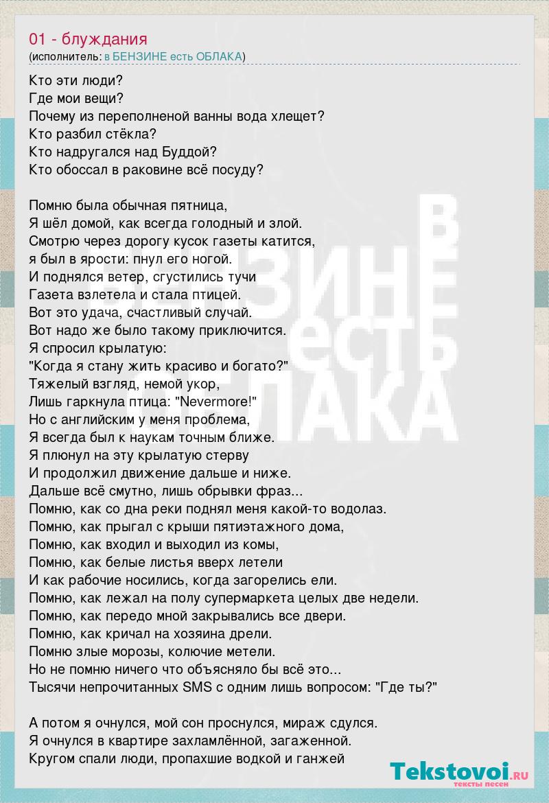 Кто эти люди? Где мои вещи? Почему из переполненой ванны вода хлещет? Кто разбил стёкла? Кто надругался над Буддой? Кто обоссал в раковине всё посуду? Помню была обычная пятница, Я шёл домой, как всегда голодный и злой. Смотрю через дорогу кусок газеты катится, я был в ярости: пнул его ногой. И поднялся ветер, сгустились тучи Газета взлетела и стала птицей. Вот это удача, счастливый случай. Вот надо же было такому приключится. Я спросил крылатую: "Когда я стану жить красиво и богато?" Тяжелый взгляд, немой укор, Лишь гаркнула птица: "Nevermore!" Но с английским у меня проблема, Я всегда был к наукам точным ближе. Я плюнул на эту крылатую стерву И продолжил движение дальше и ниже. Дальше всё смутно, лишь обрывки фраз... Помню, как со дна реки поднял меня какой-то водолаз. Помню, как прыгал c крыши пятиэтажного дома, Помню, как входил и выходил из комы, Помню, как белые листья вверх летели И как рабочие носились, когда загорелись ели. Помню, как лежал на полу супермаркета целых две недели. Помню, как передо мной закрывались все двери. Помню, как кричал на хозяина дрели. Помню злые морозы, колючие метели. Но не помню ничего что объясняло бы всё это... Тысячи непрочитанных SMS с одним лишь вопросом: "Где ты?" А потом я очнулся, мой сон проснулся, мираж сдулся. Я очнулся в квартире захламлённой, загаженной. Кругом спали люди, пропахшие водкой и ганжей