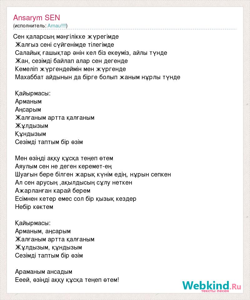 Cен қаларсың мәңгілікке жүрегімде Жалғыз сені сүйгенімде тілегімде Салайық ғашықтар әнін кел біз екеуміз, айлы түнде Жан, сезімді байлап алар сен дегенде Кемеліп жүргендеймін мен жүргенде Махаббат айдынын да бірге болып жаным нұрлы түнде Қайырмасы: Арманым Аңсарым Жалғаным артта қалғаным Жұлдызым Құндызым Сезімді таптым бір өзім Мен өзіңді аққу құсқа теңеп өтем Аяулым сен не деген керемет-ең Шуағын бере білген жарық күнім едің, нұрын сепкен Ал сен арусың ,ақылдысың сұлу неткен Ажарланған карай берем Есімнен кетер емес сол бір қызық кездер Небір көктем Қайырмасы: Арманым, аңсарым Жалғаным артта қалғаным Жұлдызым, құндызым Сезімді таптым бір өзім Араманым ансадым Ееей, өзіңді аққу құсқа теңеп өтем!