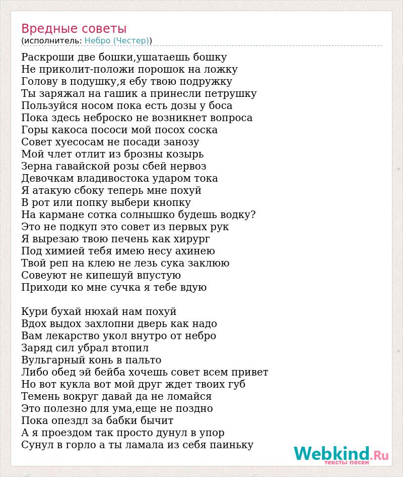 Раскроши две бошки,ушатаешь бошку Не приколит-положи порошок на ложку Голову в подушку,я ебу твою подружку Ты заряжал на гашик а принесли петрушку Пользуйся носом пока есть дозы у боса Пока здесь неброско не возникнет вопроса Горы какоса пососи мой посох соска Совет хуесосам не посади занозу Мой члет отлит из брозны козырь Зерна гавайской розы сбей нервоз Девочкам владивостока ударом тока Я атакую сбоку теперь мне похуй В рот или попку выбери кнопку На кармане сотка солнышко будешь водку? Это не подкуп это совет из первых рук Я вырезаю твою печень как хирург Под химией тебя имею несу ахинею Твой реп на клею не лезь сука заклюю Совеуют не кипешуй впустую Приходи ко мне сучка я тебе вдую Кури бухай нюхай нам похуй Вдох выдох захлопни дверь как надо Вам лекарство укол внутро от небро Заряд сил убрал втопил Вульгарный конь в пальто Либо обед эй бейба хочешь совет всем привет Но вот кукла вот мой друг ждет твоих губ Темень вокруг давай да не ломайся Это полезно для ума,еще не поздно Пока опездл за бабки бычит А я проездом так просто дунул в упор Сунул в горло а ты ламала из себя паиньку