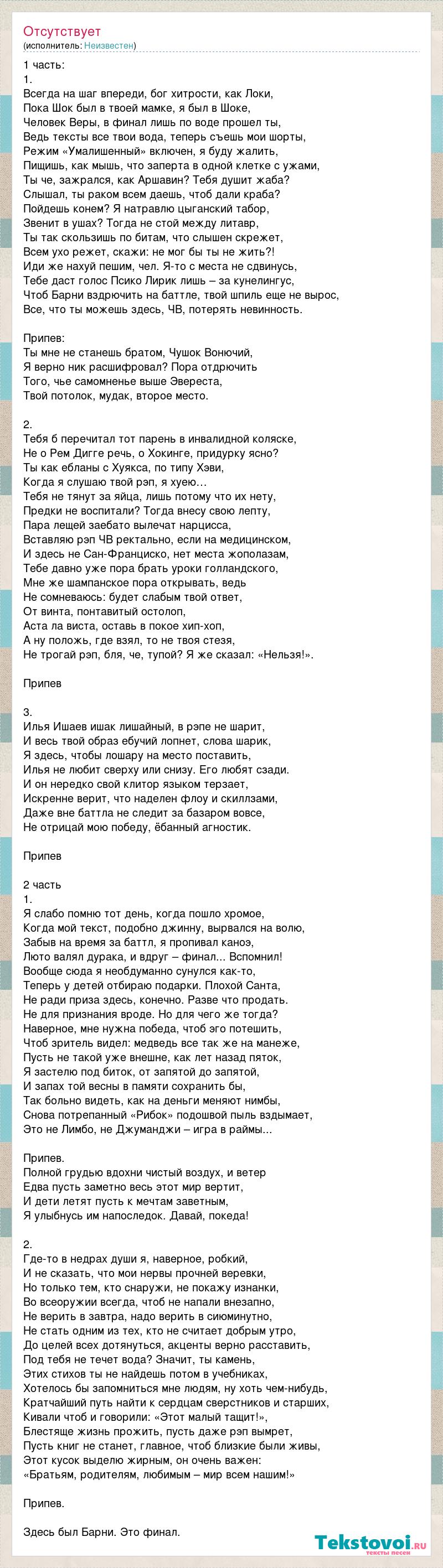 1 часть: 1. Всегда на шаг впереди, бог хитрости, как Локи, Пока Шок был в твоей мамке, я был в Шоке, Человек Веры, в финал лишь по воде прошел ты, Ведь тексты все твои вода, теперь съешь мои шорты, Режим «Умалишенный» включен, я буду жалить, Пищишь, как мышь, что заперта в одной клетке с ужами, Ты че, зажрался, как Аршавин? Тебя душит жаба? Слышал, ты раком всем даешь, чтоб дали краба? Пойдешь конем? Я натравлю цыганский табор, Звенит в ушах? Тогда не стой между литавр, Ты так скользишь по битам, что слышен скрежет, Всем ухо режет, скажи: не мог бы ты не жить?! Иди же нахуй пешим, чел. Я-то с места не сдвинусь, Тебе даст голос Псико Лирик лишь – за кунелингус, Чтоб Барни вздрючить на баттле, твой шпиль еще не вырос, Все, что ты можешь здесь, ЧВ, потерять невинность. Припев: Ты мне не станешь братом, Чушок Вонючий, Я верно ник расшифровал? Пора отдрючить Того, чье самомненье выше Эвереста, Твой потолок, мудак, второе место. 2. Тебя б перечитал тот парень в инвалидной коляске, Не о Рем Дигге речь, о Хокинге, придурку ясно? Ты как ебланы с Хуякса, по типу Хэви, Когда я слушаю твой рэп, я хуею… Тебя не тянут за яйца, лишь потому что их нету, Предки не воспитали? Тогда внесу свою лепту, Пара лещей заебато вылечат нарцисса, Вставляю рэп ЧВ ректально, если на медицинском, И здесь не Сан-Франциско, нет места жополазам, Тебе давно уже пора брать уроки голландского, Мне же шампанское пора открывать, ведь Не сомневаюсь: будет слабым твой ответ, От винта, понтавитый остолоп, Аста ла виста, оставь в покое хип-хоп, А ну положь, где взял, то не твоя стезя, Не трогай рэп, бля, че, тупой? Я же сказал: «Нельзя!». Припев 3. Илья Ишаев ишак лишайный, в рэпе не шарит, И весь твой образ ебучий лопнет, слова шарик, Я здесь, чтобы лошару на место поставить, Илья не любит сверху или снизу. Его любят сзади. И он нередко свой клитор языком терзает, Искренне верит, что наделен флоу и скиллзами, Даже вне баттла не следит за базаром вовсе, Не отрицай мою победу, ёбанный агностик. Припев 2 часть 1. Я слабо помню тот день, когда пошло хромое, Когда мой текст, подобно джинну, вырвался на волю, Забыв на время за баттл, я пропивал каноэ, Люто валял дурака, и вдруг – финал... Вспомнил! Вообще сюда я необдуманно сунулся как-то, Теперь у детей отбираю подарки. Плохой Санта, Не ради приза здесь, конечно. Разве что продать. Не для признания вроде. Но для чего же тогда? Наверное, мне нужна победа, чтоб эго потешить, Чтоб зритель видел: медведь все так же на манеже, Пусть не такой уже внешне, как лет назад пяток, Я застелю под биток, от запятой до запятой, И запах той весны в памяти сохранить бы, Так больно видеть, как на деньги меняют нимбы, Снова потрепанный «Рибок» подошвой пыль вздымает, Это не Лимбо, не Джуманджи – игра в раймы... Припев. Полной грудью вдохни чистый воздух, и ветер Едва пусть заметно весь этот мир вертит, И дети летят пусть к мечтам заветным, Я улыбнусь им напоследок. Давай, покеда! 2. Где-то в недрах души я, наверное, робкий, И не сказать, что мои нервы прочней веревки, Но только тем, кто снаружи, не покажу изнанки, Во всеоружии всегда, чтоб не напали внезапно, Не верить в завтра, надо верить в сиюминутно, Не стать одним из тех, кто не считает добрым утро, До целей всех дотянуться, акценты верно расставить, Под тебя не течет вода? Значит, ты камень, Этих стихов ты не найдешь потом в учебниках, Хотелось бы запомниться мне людям, ну хоть 