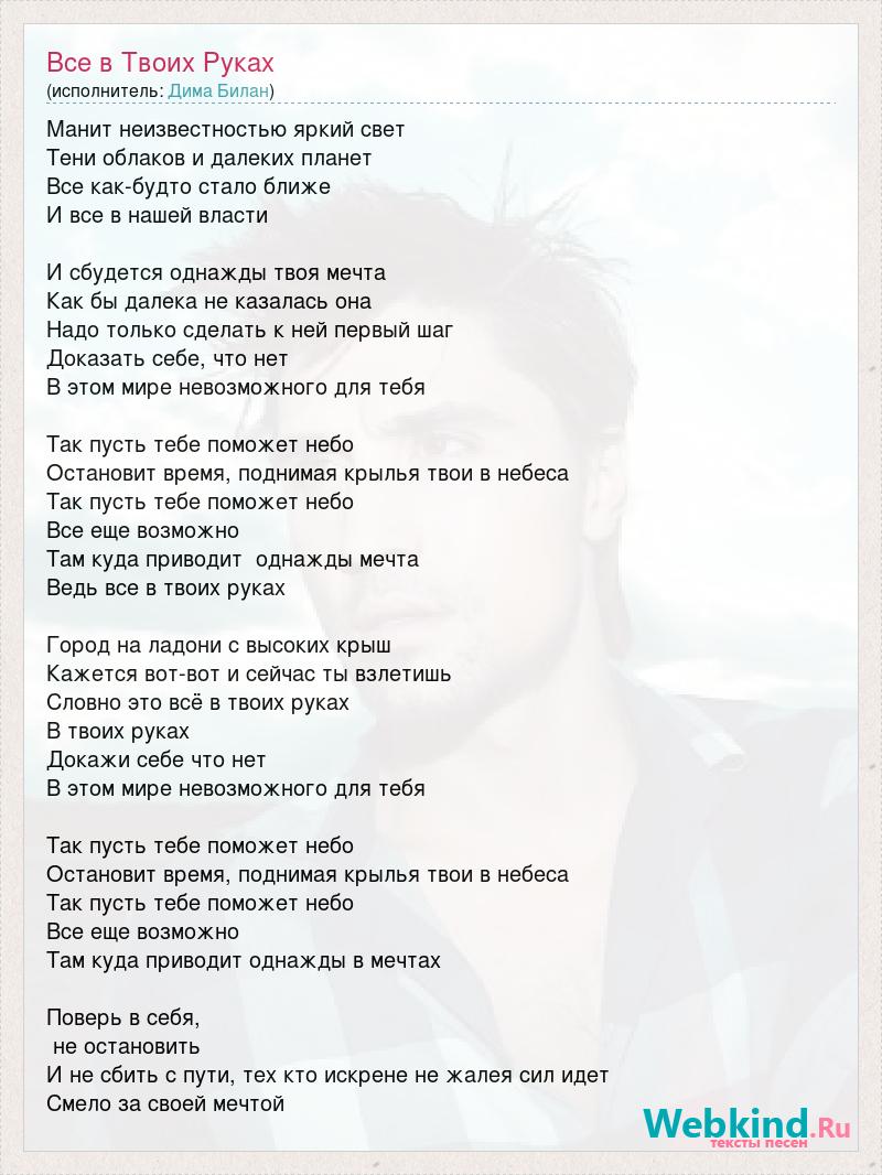 Манит неизвестностью яркий свет Тени облаков и далеких планет Все как-будто стало ближе И все в нашей власти И сбудется однажды твоя мечта Как бы далека не казалась она Надо только сделать к ней первый шаг Доказать себе, что нет В этом мире невозможного для тебя Так пусть тебе поможет небо Остановит время, поднимая крылья твои в небеса Так пусть тебе поможет небо Все еще возможно Там куда приводит однажды мечта Ведь все в твоих руках Город на ладони с высоких крыш Кажется вот-вот и сейчас ты взлетишь Словно это всё в твоих руках В твоих руках Докажи себе что нет В этом мире невозможного для тебя Так пусть тебе поможет небо Остановит время, поднимая крылья твои в небеса Так пусть тебе поможет небо Все еще возможно Там куда приводит однажды в мечтах Поверь в себя, не остановить И не сбить с пути, тех кто искрене не жалея сил идет Смело за своей мечтой