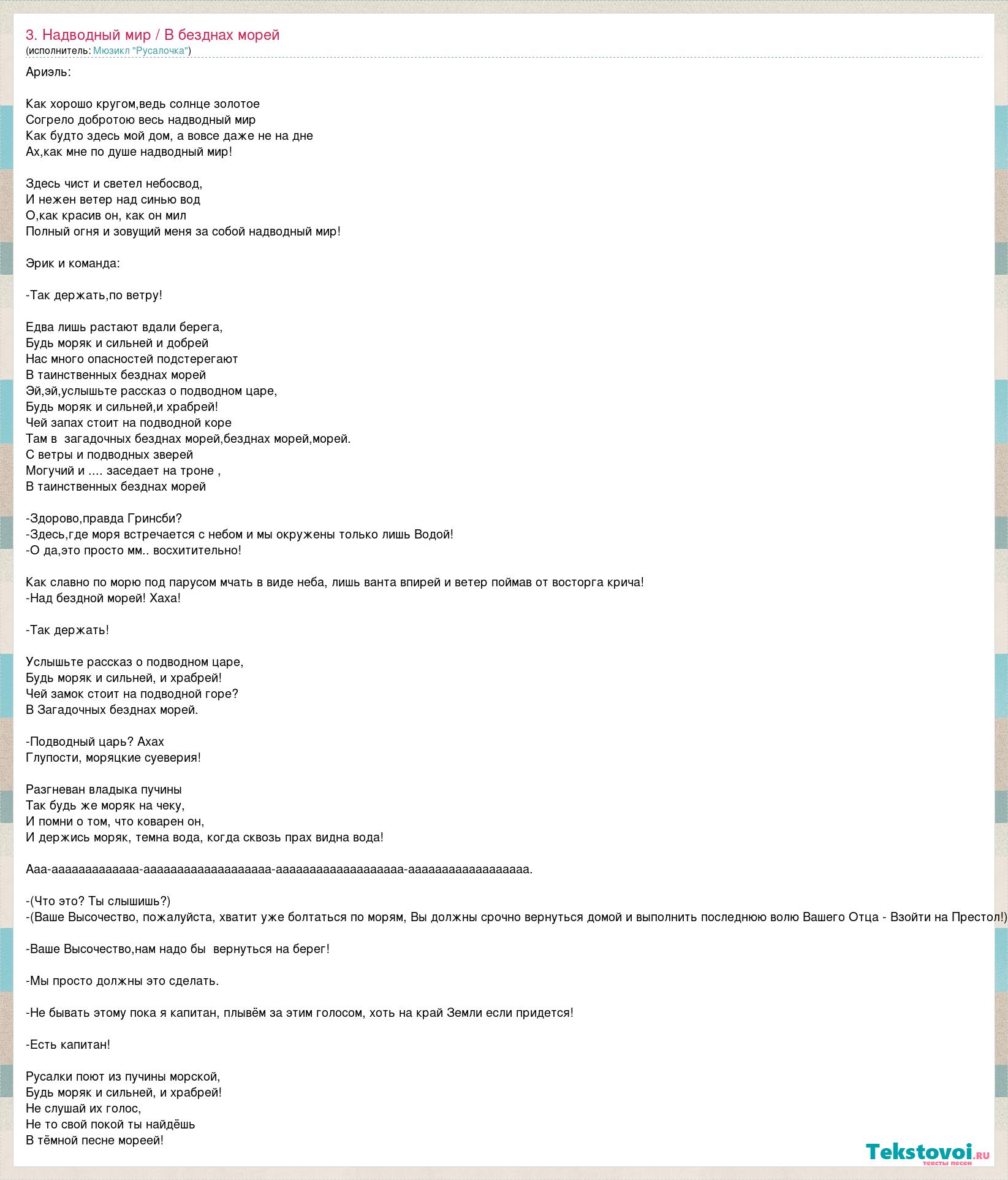 Ариэль: Как хорошо кругом,ведь солнце золотое Согрело добротою весь надводный мир Как будто здесь мой дом, а вовсе даже не на дне Ах,как мне по душе надводный мир! Здесь чист и светел небосвод, И нежен ветер над синью вод О,как красив он, как он мил Полный огня и зовущий меня за собой надводный мир! Эрик и команда: -Так держать,по ветру! Едва лишь растают вдали берега, Будь моряк и сильней и добрей Нас много опасностей подстерегают В таинственных безднах морей Эй,эй,услышьте рассказ о подводном царе, Будь моряк и сильней,и храбрей! Чей запах стоит на подводной коре Там в загадочных безднах морей,безднах морей,морей. С ветры и подводных зверей Могучий и .... заседает на троне , В таинственных безднах морей -Здорово,правда Гринсби? -Здесь,где моря встречается с небом и мы окружены только лишь Водой! -О да,это просто мм.. восхитительно! Как славно по морю под парусом мчать в виде неба, лишь ванта впирей и ветер поймав от восторга крича! -Над бездной морей! Хаха! -Так держать! Услышьте рассказ о подводном царе, Будь моряк и сильней, и храбрей! Чей замок стоит на подводной горе? В Загадочных безднах морей. -Подводный царь? Ахах Глупости, моряцкие суеверия! Разгневан владыка пучины Так будь же моряк на чеку, И помни о том, что коварен он, И держись моряк, темна вода, когда сквозь прах видна вода! Ааа-ааааааааааааа-ааааааааааааааааааа-ааааааааааааааааааа-аааааааааааааааааа. -(Что это? Ты слышишь?) -(Ваше Высочество, пожалуйста, хватит уже болтаться по морям, Вы должны срочно вернуться домой и выполнить последнюю волю Вашего Отца - Взойти на Престол!) -Ваше Высочество,нам надо бы вернуться на берег! -Мы просто должны это сделать. -Не бывать этому пока я капитан, плывём за этим голосом, хоть на край Земли если придется! -Есть капитан! Русалки поют из пучины морской, Будь моряк и сильней, и храбрей! Не слушай их голос, Не то свой покой ты найдёшь В тёмной песне мореей!