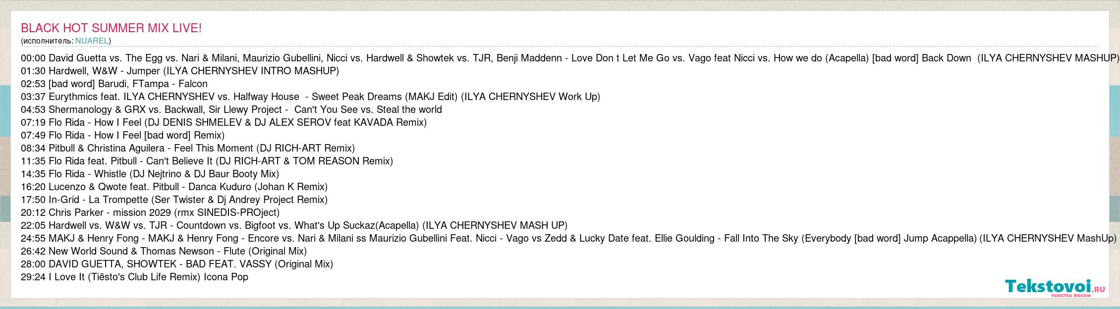 00:00 David Guetta vs. The Egg vs. Nari & Milani, Maurizio Gubellini, Nicci vs. Hardwell & Showtek vs. TJR, Benji Maddenn - Love Don t Let Me Go vs. Vago feat Nicci vs. How we do (Acapella) vs. Come Back Down (ILYA CHERNYSHEV MASHUP) 01:30 Hardwell, W&W - Jumper (ILYA CHERNYSHEV INTRO MASHUP) 02:53 Bruno Barudi, FTampa - Falcon 03:37 Eurythmics feat. ILYA CHERNYSHEV vs. Halfway House - Sweet Peak Dreams (MAKJ Edit) (ILYA CHERNYSHEV Work Up) 04:53 Shermanology & GRX vs. Backwall, Sir Llewy Project - Can't You See vs. Steal the world 07:19 Flo Rida - How I Feel (DJ DENIS SHMELEV & DJ ALEX SEROV feat KAVADA Remix) 07:49 Flo Rida - How I Feel (Citrus Remix) 08:34 Pitbull & Christina Aguilera - Feel This Moment (DJ RICH-ART Remix) 11:35 Flo Rida feat. Pitbull - Can't Believe It (DJ RICH-ART & TOM REASON Remix) 14:35 Flo Rida - Whistle (DJ Nejtrino & DJ Baur Booty Mix) 16:20 Lucenzo & Qwote feat. Pitbull - Danca Kuduro (Johan K Remix) 17:50 In-Grid - La Trompette (Ser Twister & Dj Andrey Project Remix) 20:12 Chris Parker - mission 2029 (rmx SINEDIS-PROject) 22:05 Hardwell vs. W&W vs. TJR - Countdown vs. Bigfoot vs. What's Up Suckaz(Acapella) (ILYA CHERNYSHEV MASH UP) 24:55 MAKJ & Henry Fong - MAKJ & Henry Fong - Encore vs. Nari & Milani ss Maurizio Gubellini Feat. Nicci - Vago vs Zedd & Lucky Date feat. Ellie Goulding - Fall Into The Sky (Everybody [bad word] Jump Acappella) (ILYA CHERNYSHEV MashUp) 26:42 New World Sound & Thomas Newson - Flute (Original Mix) 28:00 DAVID GUETTA, SHOWTEK - BAD FEAT. VASSY (Original Mix) 29:24 I Love It (Tiësto's Club Life Remix) Icona Pop