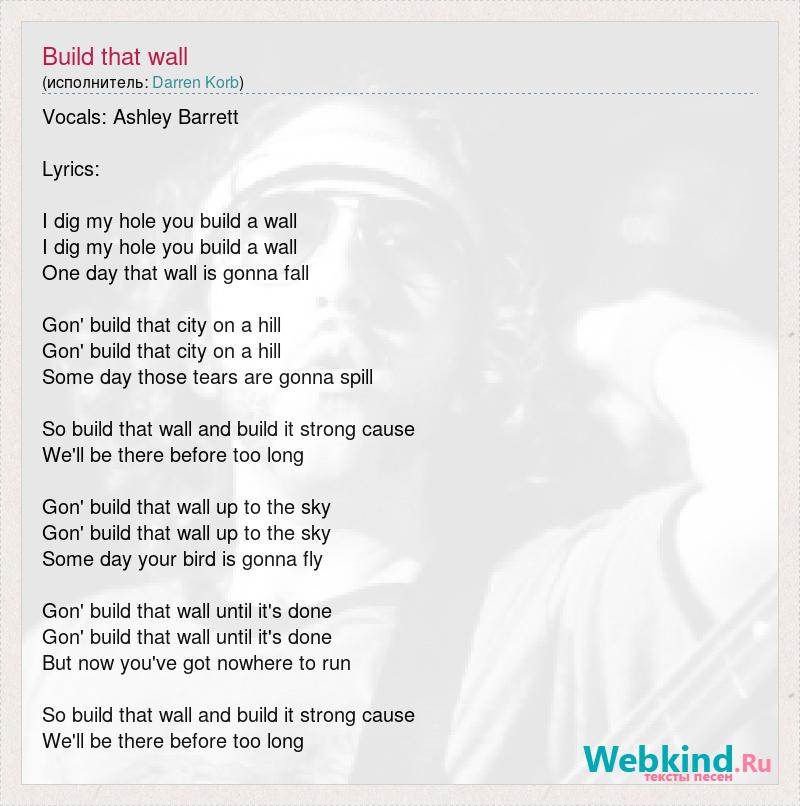 Vocals: Ashley Barrett Lyrics: I dig my hole you build a wall I dig my hole you build a wall One day that wall is gonna fall Gon' build that city on a hill Gon' build that city on a hill Some day those tears are gonna spill So build that wall and build it strong cause We'll be there before too long Gon' build that wall up to the sky Gon' build that wall up to the sky Some day your bird is gonna fly Gon' build that wall until it's done Gon' build that wall until it's done But now you've got nowhere to run So build that wall and build it strong cause We'll be there before too long