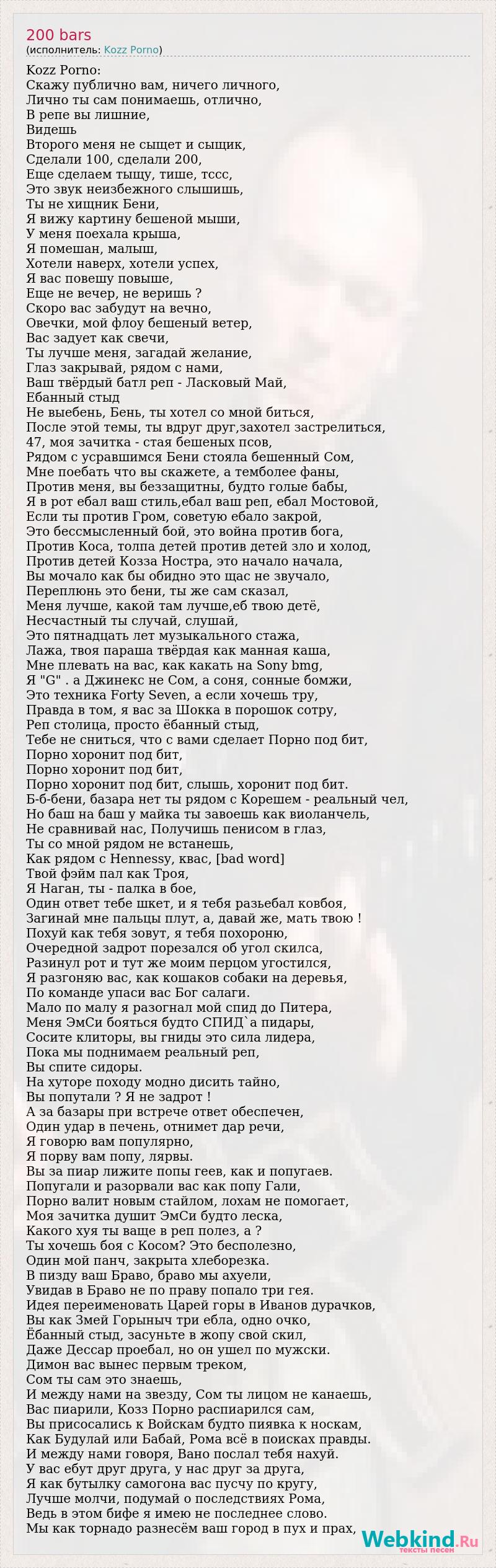 Kozz Porno: Скажу публично вам, ничего личного, Лично ты сам понимаешь, отлично, В репе вы лишние, Видешь Второго меня не сыщет и сыщик, Сделали 100, сделали 200, Еще сделаем тыщу, тише, тссс, Это звук неизбежного слышишь, Ты не хищник Бени, Я вижу картину бешеной мыши, У меня поехала крыша, Я помешан, малыш, Хотели наверх, хотели успех, Я вас повешу повыше, Еще не вечер, не веришь ? Скоро вас забудут на вечно, Овечки, мой флоу бешеный ветер, Вас задует как свечи, Ты лучше меня, загадай желание, Глаз закрывай, рядом с нами, Ваш твёрдый батл реп - Ласковый Май, Ебанный стыд Не выебень, Бень, ты хотел со мной биться, После этой темы, ты вдруг друг,захотел застрелиться, 47, моя зачитка - стая бешеных псов, Рядом с усравшимся Бени стояла бешенный Сом, Мне поебать что вы скажете, а темболее фаны, Против меня, вы беззащитны, будто голые бабы, Я в рот ебал ваш стиль,ебал ваш реп, ебал Мостовой, Если ты против Гром, советую ебало закрой, Это бессмысленный бой, это война против бога, Против Коса, толпа детей против детей зло и холод, Против детей Козза Ностра, это начало начала, Вы мочало как бы обидно это щас не звучало, Переплюнь это бени, ты же сам сказал, Меня лучше, какой там лучше,еб твою детё, Несчастный ты случай, слушай, Это пятнадцать лет музыкального стажа, Лажа, твоя параша твёрдая как манная каша, Мне плевать на вас, как какать на Sony bmg, Я "G" . а Джинекс не Сом, а соня, сонные бомжи, Это техника Forty Seven, а если хочешь тру, Правда в том, я вас за Шокка в порошок сотру, Реп столица, просто ёбанный стыд, Тебе не сниться, что с вами сделает Порно под бит, Порно хоронит под бит, Порно хоронит под бит, Порно хоронит под бит, слышь, хоронит под бит. Б-б-бени, базара нет ты рядом с Корешем - реальный чел, Но баш на баш у майка ты завоешь как виоланчель, Не сравнивай нас, Получишь пенисом в глаз, Ты со мной рядом не встанешь, Как рядом с Hennessy, квас, [bad word] Твой фэйм пал как Троя, Я Наган, ты - палка в бое, Один ответ тебе шкет, и я тебя разьебал ковбоя, Загинай мне пальцы плут, а, давай же, мать твою ! Похуй как тебя зовут, я тебя похороню, Очередной задрот порезался об угол скилса, Разинул рот и тут же моим перцом угостился, Я разгоняю вас, как кошаков собаки на деревья, По команде упаси вас Бог салаги. Мало по малу я разогнал мой спид до Питера, Меня ЭмСи бояться будто СПИД`a пидары, Сосите клиторы, вы гниды это сила лидера, Пока мы поднимаем реальный реп, Вы спите сидоры. На хуторе походу модно дисить тайно, Вы попутали ? Я не задрот ! А за базары при встрече ответ обеспечен, Один удар в печень, отнимет дар речи, Я говорю вам популярно, Я порву вам попу, лярвы. Вы за пиар лижите попы геев, как и попугаев. Попугали и разорвали вас как попу Гали, Порно валит новым стайлом, лохам не помогает, Моя зачитка душит ЭмСи будто леска, Какого хуя ты ваще в реп полез, а ? Ты хочешь боя с Косом? Это бесполезно, Один мой панч, закрыта хлеборезка. В пизду ваш Браво, браво мы ахуели, Увидав в Браво не по праву попало три гея. Идея переименовать Царей горы в Иванов дурачков, Вы как Змей Горыныч три ебла, одно очко, Ёбанный стыд, засуньте в жопу свой скил, Даже Дессар проебал, но он ушел по мужски. Димон вас вынес первым треком, Сом ты сам это знаешь, И между нами на звезду, Сом ты лицом не канаешь, Вас пиарили, Козз Порно распиарился сам, Вы присосались к Войскам будто пиявка к носкам, Как Будулай или Бабай, Рома всё в поисках правды. И между нами говор