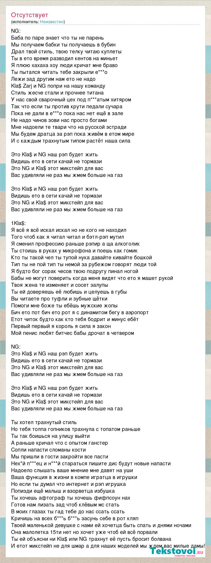 NG: Баба по паре знает что ты не парень Мы получаем бабки ты получаешь в бубин Драл твой стиль, твою телку читаю куплеты Ты в ето время разводил кентов на миньет Я плюю хахаха хоу люди кричат мне браво Ты пытался читать тебе закрыли е***о Лежи зад другим нам ето не надо Kla$ Zarj и NG попри на нашу команду Стиль жесче стали и прочнее титана У нас свой сварочный цех под п***атым хитяром Так что если ты против крути педали сучара Пока не дали в е***о пока нас нет ещё в зале Не надо чинов зови нас просто богами Мне надоели те твари что на русской эстради Мы будем дратца за рэп пока живём в етом мире И с каждым трахнутым типом растёт наша сила Это Kla$ и NG наш рэп будет жить Видишь ето в сети качай не тормази Это NG и Kla$ этот микстейп для вас Вас удивляли не раз мы жмем больше на газ Это Kla$ и NG наш рэп будет жить Видишь ето в сети качай не тормази Это NG и Kla$ этот микстейп для вас Вас удивляли не раз мы жмем больше на газ 1Kla$: Я всё я всё искал искал но не кого не находил Того чтоб как я читал читал и бэтл-рэп мутил Я сменил профессию раньше рэпир а ща алкоголик Ты стоишь в руках у микрофона и поешь как гомик Кто ты такой чел ты тупой нука давайте кивайте бошкой Тип ты не пой тип ты немой за рубежом говорят люди той Я будто бог сорак чесов твою подругу пинал ногой Бабы не могут поверить когда меня видят что ето я машет рукой Твоя жена те изменяет и сосет залупы Ты ей доверяешь её любишь и целуешь в губы Вы читаете про туфли и зубные щётки Помоги мне боже ты ебёшь мужские жопы Бич ето пот бич ето рот я с динамитом бегу в аэропорт Етот читок будто как кто тебя бодрит и минус ебёт Первый первый я король я сила я закон Мой пенис любят битчес бабы дрочат в четвером NG: Это Kla$ и NG наш рэп будет жить Видишь ето в сети качай не тормази Это NG и Kla$ этот микстейп для вас Вас удивляли не раз мы жмем больше на газ Это Kla$ и NG наш рэп будет жить Видишь ето в сети качай не тормази Это NG и Kla$ этот микстейп для вас Вас удивляли не раз мы жмем больше на газ Ты хотел трахнутый стиль Но тебя толпа гопников трахнула с топатом раньше Ты так боишься на улицу выйти А раньше кричал что с опытом ганстер Сопли напасти сломаны кости Мы пришли в гости закройти все пасти Нех*й п***ец и н***й стараться пишите дис будут новые напасти Надоело слышать ваше мнение мне давят на уши Ваша функция в жизни в компе игратца в игрушки Но если ты думал что интернет и рэп игрушка Попизди ещё малыш и взорветца избушка Ты хочешь афтограф ты хочешь фифпсоун нах Готов нам лизать зад чтоб клёвым мс стать В моих глазах ты гад тебе до нас ссать ссать Кричишь на всех б***ь б***ь засунь себе в рот кляп Твоей маленькой девушке с нами ей хочетца быть спать и днями ночами Она малолетка 15ти нет но хочет уже чтоб ей всё порвали Ты ей объясни ни Kla$ или NG трахнут её пусть бросит болвана И етот микстейп не для шмар а для наших моделей мы ждем вас милые дамы!