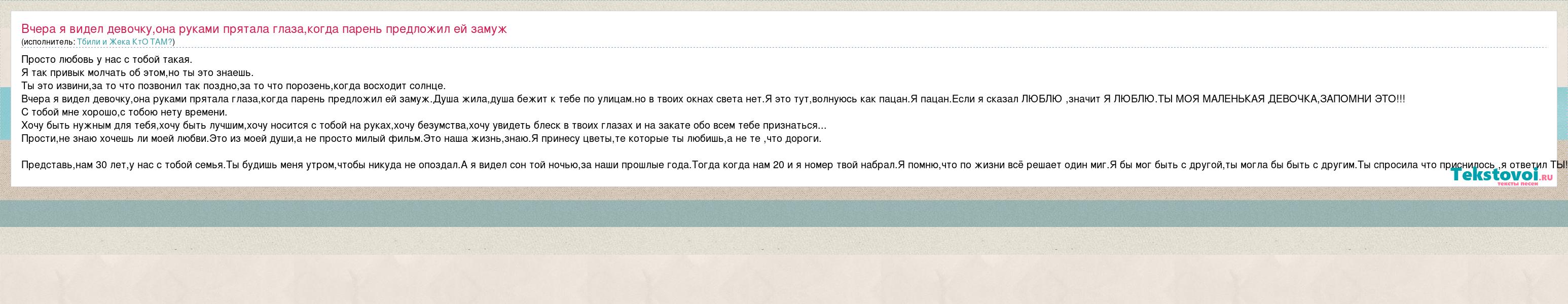 Главная→Исполнители→Тбили и Жека КтО ТАМ?→Вчера я видел девочку,она руками прятала глаза,когда парень предложил ей з