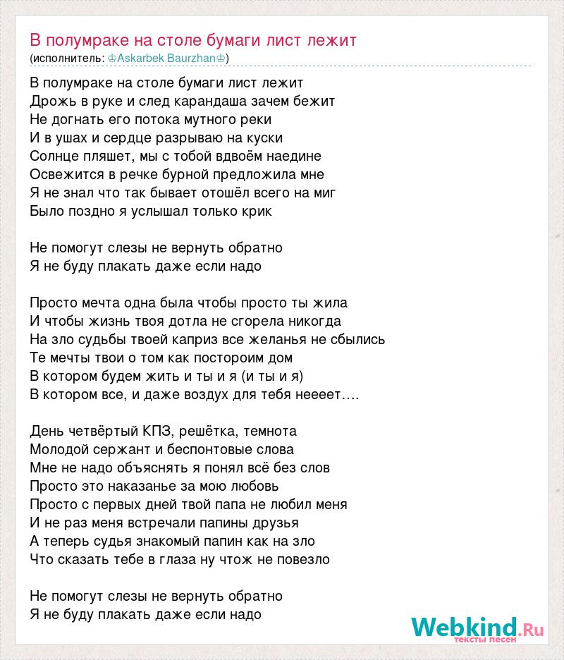 В полумраке на столе бумаги лист лежит Дрожь в руке и след карандаша зачем бежит Не догнать его потока мутного реки И в ушах и сердце разрываю на куски Солнце пляшет, мы с тобой вдвоём наедине Освежится в речке бурной предложила мне Я не знал что так бывает отошёл всего на миг Было поздно я услышал только крик Не помогут слезы не вернуть обратно Я не буду плакать даже если надо Просто мечта одна была чтобы просто ты жила И чтобы жизнь твоя дотла не сгорела никогда На зло судьбы твоей каприз все желанья не сбылись Те мечты твои о том как постороим дом В котором будем жить и ты и я (и ты и я) В котором все, и даже воздух для тебя неееет…. День четвёртый КПЗ, решётка, темнота Молодой сержант и беспонтовые слова Мне не надо объяснять я понял всё без слов Просто это наказанье за мою любовь Просто с первых дней твой папа не любил меня И не раз меня встречали папины друзья А теперь судья знакомый папин как на зло Что сказать тебе в глаза ну чтож не повезло Не помогут слезы не вернуть обратно Я не буду плакать даже если надо