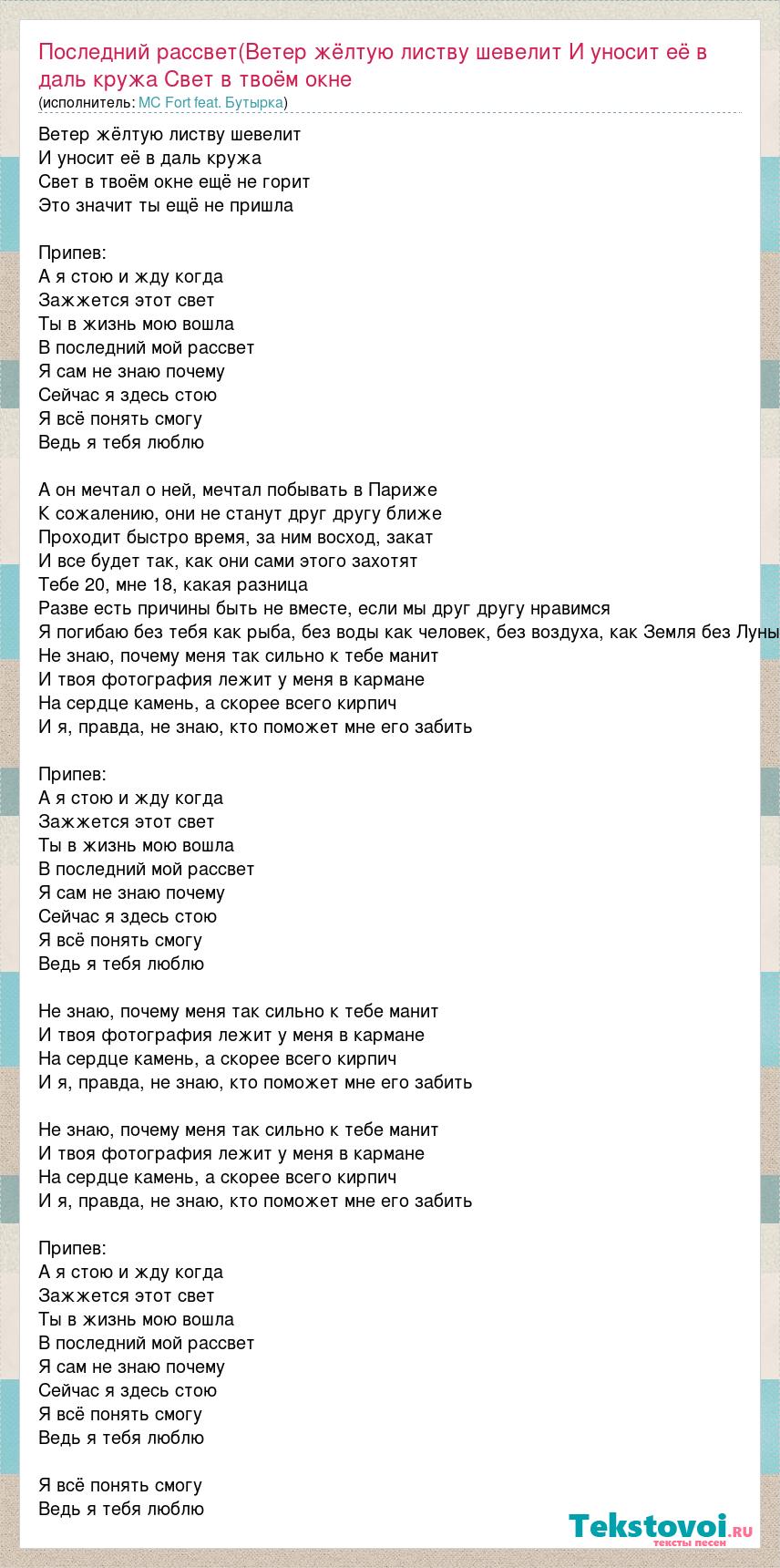 Ветер жёлтую листву шевелит И уносит её в даль кружа Свет в твоём окне ещё не горит Это значит ты ещё не пришла Припев: А я стою и жду когда Зажжется этот свет Ты в жизнь мою вошла В последний мой рассвет Я сам не знаю почему Сейчас я здесь стою Я всё понять смогу Ведь я тебя люблю А он мечтал о ней, мечтал побывать в Париже К сожалению, они не станут друг другу ближе Проходит быстро время, за ним восход, закат И все будет так, как они сами этого захотят Тебе 20, мне 18, какая разница Разве есть причины быть не вместе, если мы друг другу нравимся Я погибаю без тебя как рыба, без воды как человек, без воздуха, как Земля без Луны Не знаю, почему меня так сильно к тебе манит И твоя фотография лежит у меня в кармане На сердце камень, а скорее всего кирпич И я, правда, не знаю, кто поможет мне его забить Припев: А я стою и жду когда Зажжется этот свет Ты в жизнь мою вошла В последний мой рассвет Я сам не знаю почему Сейчас я здесь стою Я всё понять смогу Ведь я тебя люблю Не знаю, почему меня так сильно к тебе манит И твоя фотография лежит у меня в кармане На сердце камень, а скорее всего кирпич И я, правда, не знаю, кто поможет мне его забить Не знаю, почему меня так сильно к тебе манит И твоя фотография лежит у меня в кармане На сердце камень, а скорее всего кирпич И я, правда, не знаю, кто поможет мне его забить Припев: А я стою и жду когда Зажжется этот свет Ты в жизнь мою вошла В последний мой рассвет Я сам не знаю почему Сейчас я здесь стою Я всё понять смогу Ведь я тебя люблю Я всё понять смогу Ведь я тебя люблю