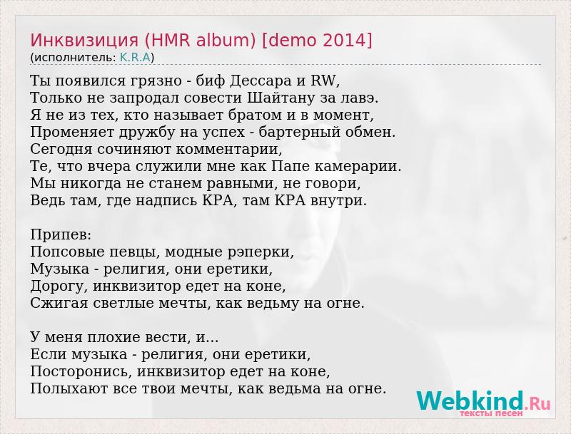 Ты появился грязно - биф Дессара и RW, Только не запродал совести Шайтану за лавэ. Я не из тех, кто называет братом и в момент, Променяет дружбу на успех - бартерный обмен. Сегодня сочиняют комментарии, Те, что вчера служили мне как Папе камерарии. Мы никогда не станем равными, не говори, Ведь там, где надпись КРА, там КРА внутри. Припев: Попсовые певцы, модные рэперки, Музыка - религия, они еретики, Дорогу, инквизитор едет на коне, Сжигая светлые мечты, как ведьму на огне. У меня плохие вести, и... Если музыка - религия, они еретики, Посторонись, инквизитор едет на коне, Полыхают все твои мечты, как ведьма на огнe.