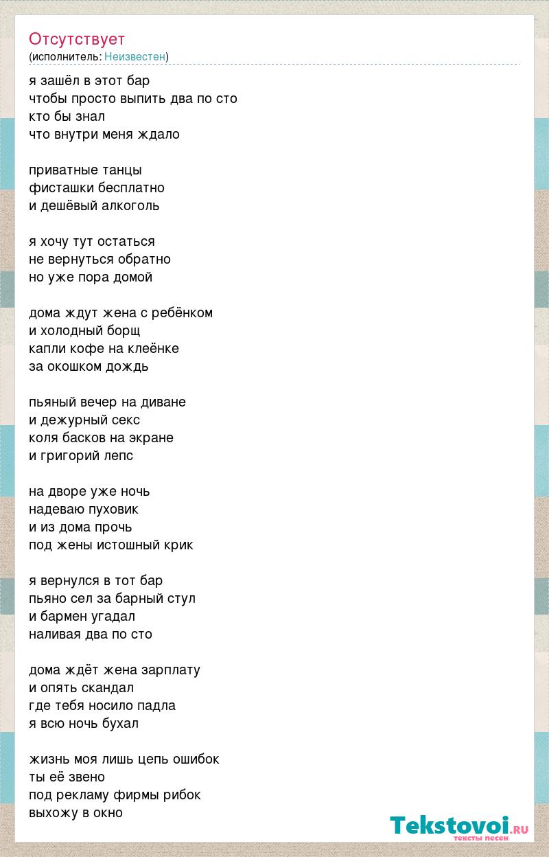 я зашёл в этот бар чтобы просто выпить два по сто кто бы знал что внутри меня ждало приватные танцы фисташки бесплатно и дешёвый алкоголь я хочу тут остаться не вернуться обратно но уже пора домой дома ждут жена с ребёнком и холодный борщ капли кофе на клеёнке за окошком дождь пьяный вечер на диване и дежурный секс коля басков на экране и григорий лепс на дворе уже ночь надеваю пуховик и из дома прочь под жены истошный крик я вернулся в тот бар пьяно сел за барный стул и бармен угадал наливая два по сто дома ждёт жена зарплату и опять скандал где тебя носило падла я всю ночь бухал жизнь моя лишь цепь ошибок ты её звено под рекламу фирмы рибок выхожу в окно